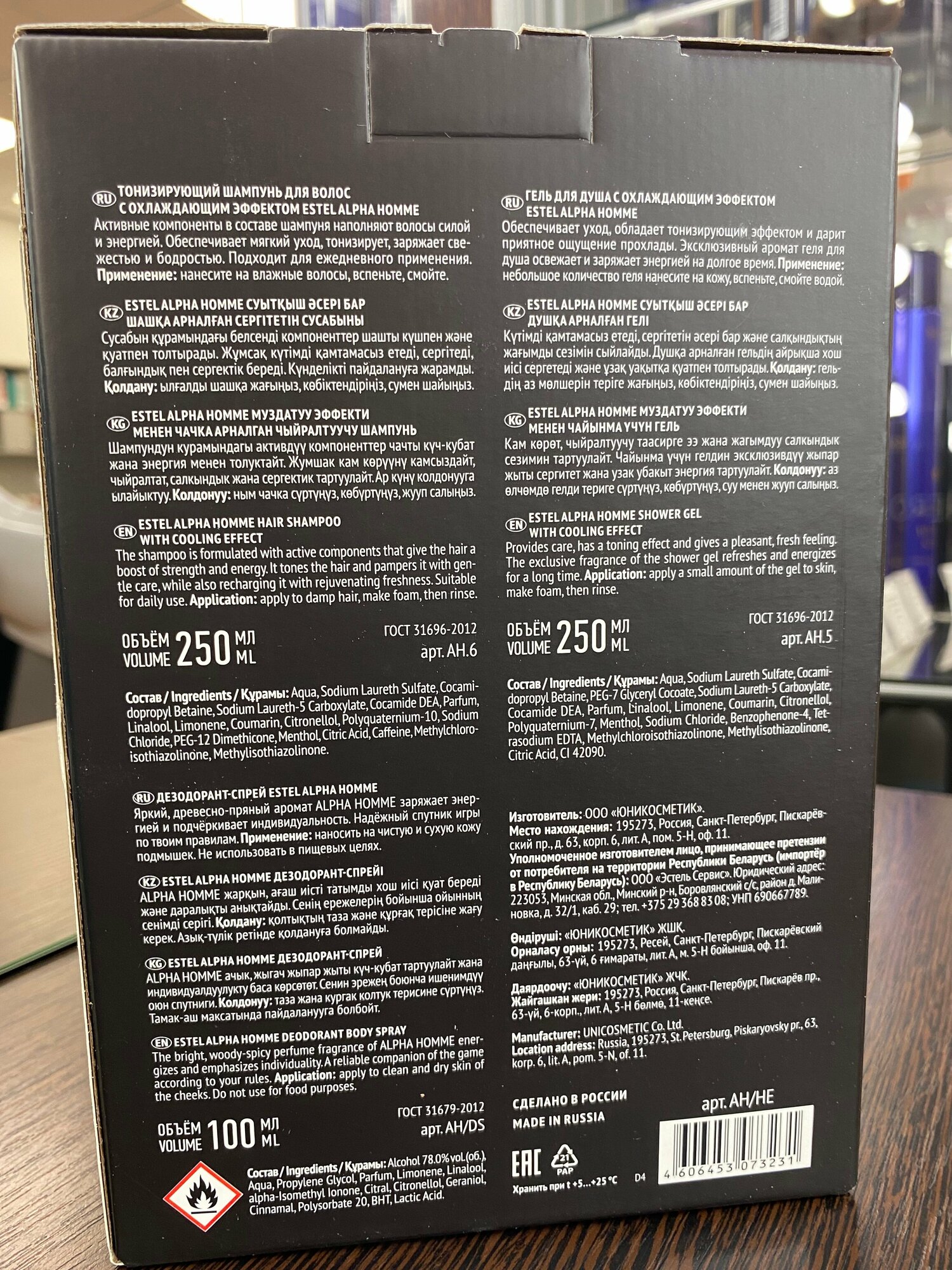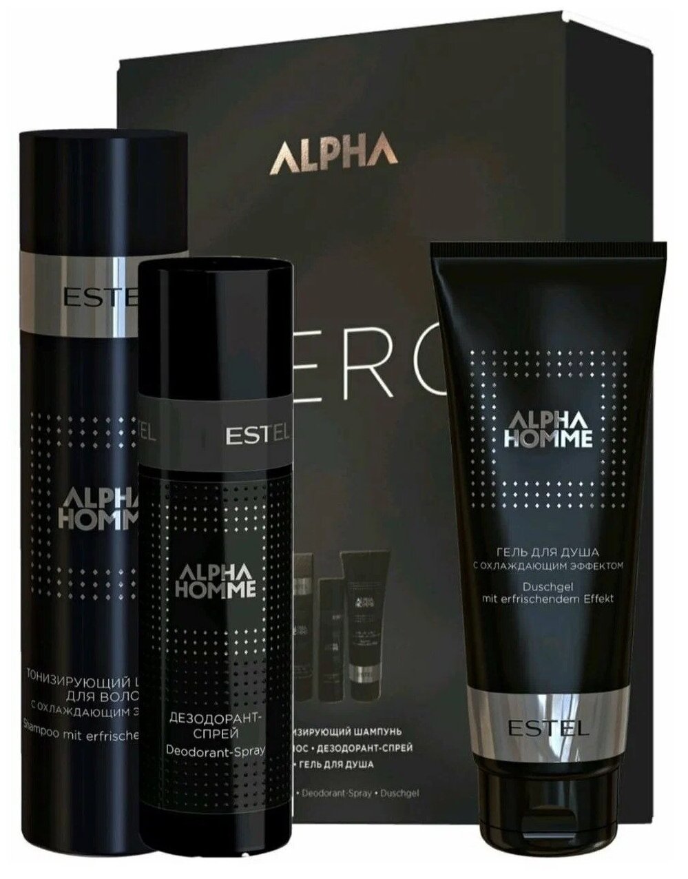 В подарочный набор для мужчин Alpha Homme Hero от Estel входят 3 продукта: шампунь для волос, гель для душа и дезодорант-спрей. Упаковка: коробка из плотного картона. Тонизирующий шампунь: объем 250 мл, крышка диск-топ, сульфатный (ПАВ - Sodium Laureth Sulfate), хорошо промывает, есть охлаждающий эффект, имеет насыщенный аромат. Гель для душа: объем 250 мл, мягкая туба, экономичный расход, освежает и бодрит, приятный аромат. Дезодорант-спрей: объем 100 мл, дополнительно упакован в картонную коробку, аромат древесно-пряный. Хороший вариант для подарка.