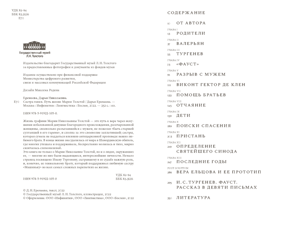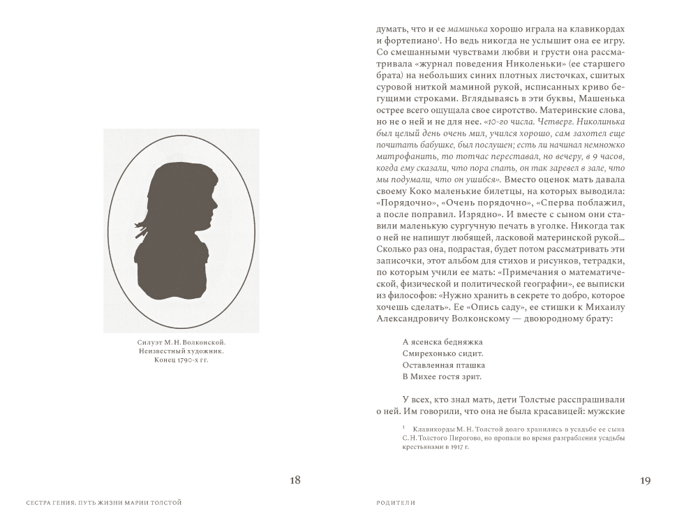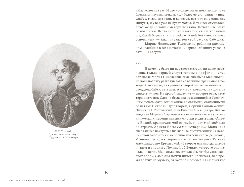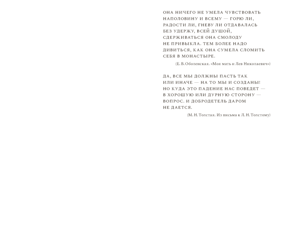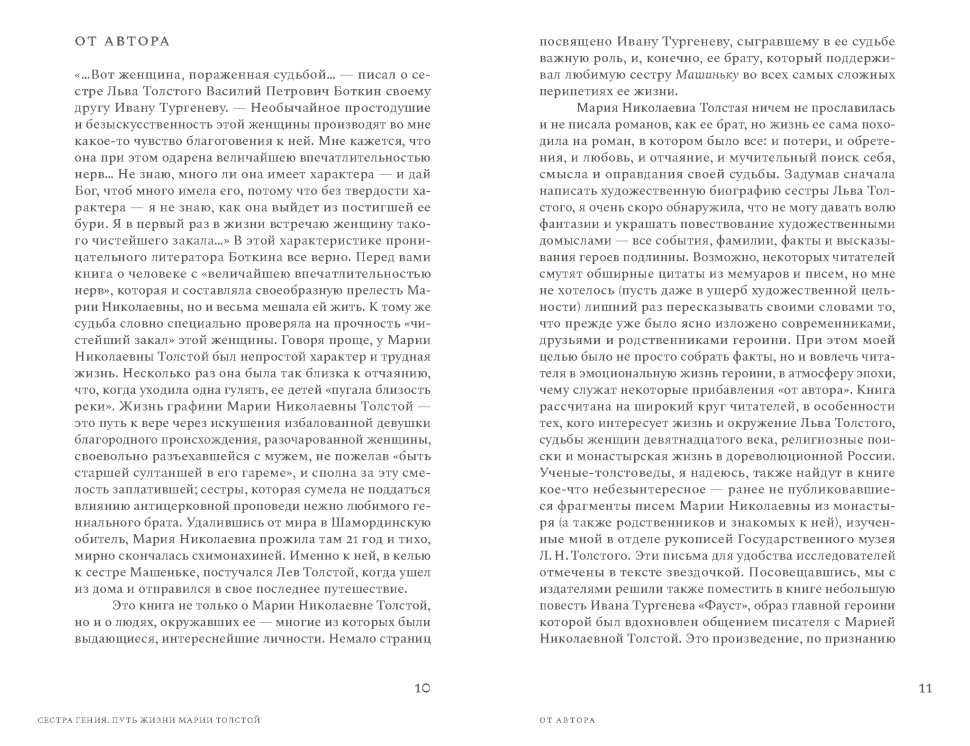 Это книга не только о Марии Николаевне Толстой, но и о людях, окружавших ее, — многие из них были выдающиеся, интереснейшие личности. Немало страниц посвящено Ивану Тургеневу, сыгравшему в ее судьбе важную роль, и, конечно, ее гениальному брату, который поддерживал любимую сестру «Машиньку» во всех самых сложных перипетиях ее жизни.