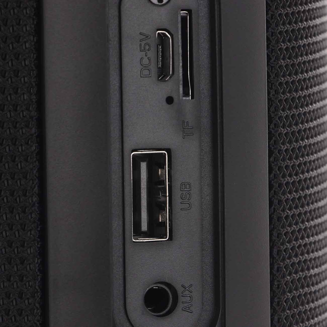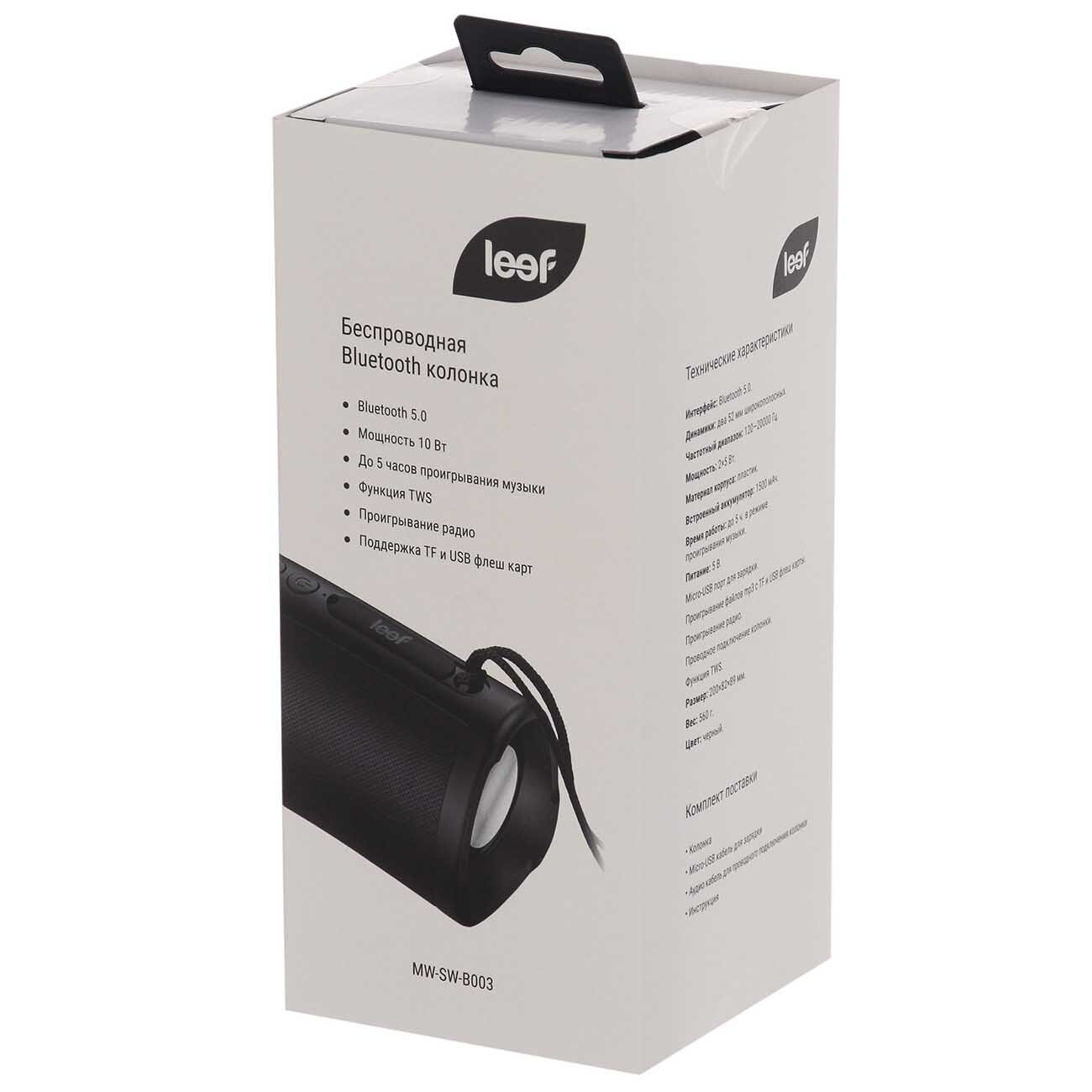 Колонка Leef MW-SW-B003 подключается к смартфону или планшету по Bluetooth либо с помощью кабеля AUX. В комплекте есть плечевой ремень для переноски. Отличный звук Небольшая аудиосистема оснащена двумя 5-ваттными динамиками. С ней нетрудно устроить настоящую дискотеку дома, на даче или во время пикника за городом. Она отлично воспроизводит мощные динамичные басы. С разных носителей У модели есть слот для карт памяти и USB-порт для флешек. Также в неё встроен радиоприёмник. Автономность Источником питания служит аккумулятор, ёмкость которого составляет 1500 мАч. Такого запаса энергии хватит примерно на 5 часов прослушивания музыки.