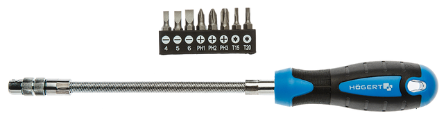 Техническое описание:Отвертка с гибким стержнем 175 мм и комплектом наконечников: плоские наконечники 4.5 мм и 6 мм,крестообразные наконечники PH1, PH2, PH3 и наконечники типа Torx T15 и T20. Идеально подходит дляработы в труднодоступных местах, когда нет возможности использовать обычную отвертку.Техническая характеристика:- в комплекте 8 отверточных битов- гибкий стержень позволяет добраться до труднодоступных мест- изготовлена из высококачественной хромванадиевой стали- устойчива к деформациям и повреждениям- отверстие в рукоятке позволяет повесить отвертку- двухкомпонентная рукоятка со специальной профилированнойпротивоскользящей поверхностью повышает силу затяжки