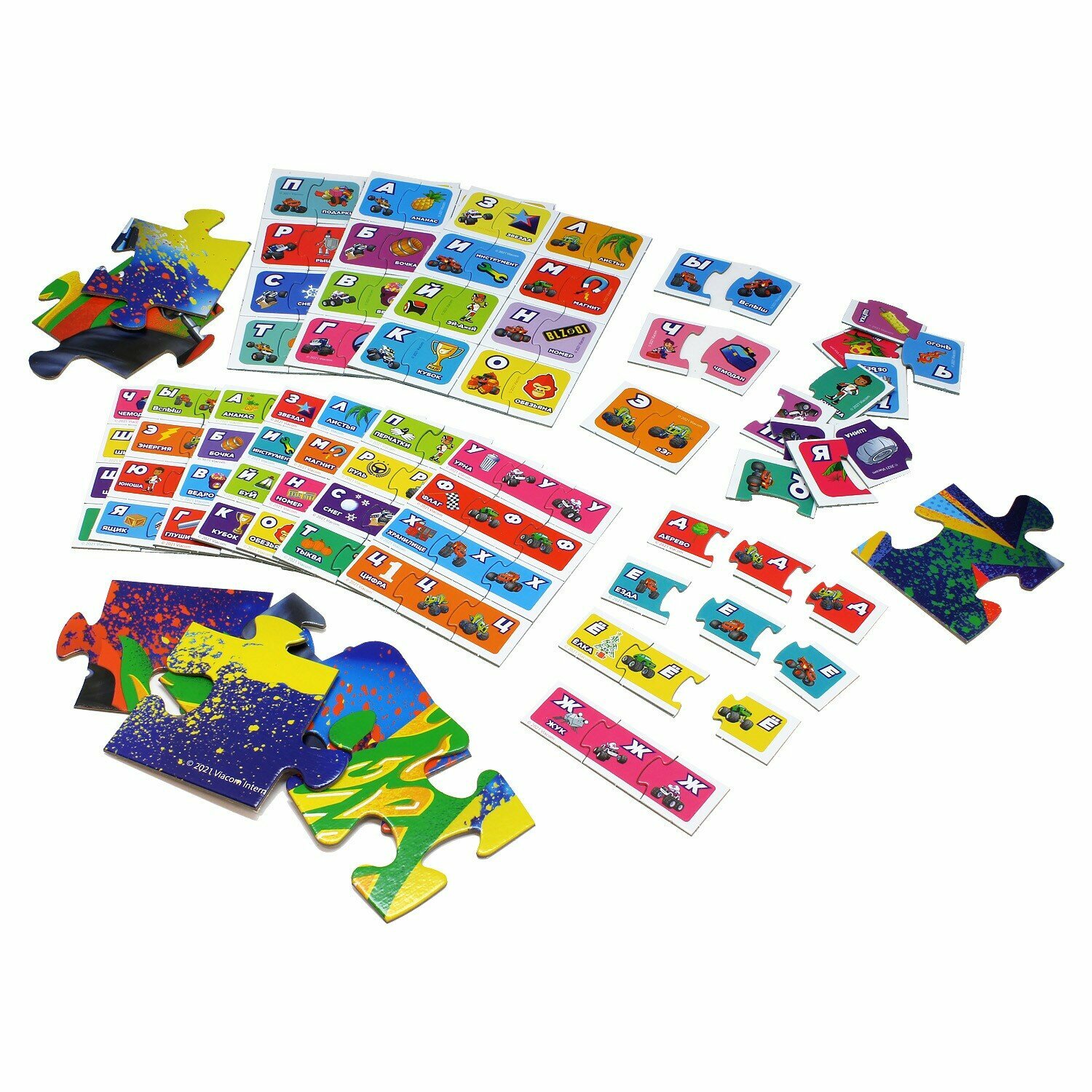 Обучающий набор 3 в 1 создан для занятий с ребенком. Внутри набора вы найдете словарик из 96 пазловых элементов. Азбуку из 64 пазловых элементов. И пазл из 35 элементов размером 330х460 мм.