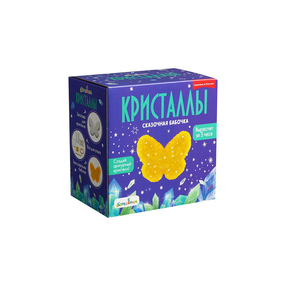 Выращивание кристаллов – это отличная возможность не только понаблюдать за чудесами окружающего мира, но и сотворить их самому! С набором «Кристаллы:Сказочная бабочка» вы сможете изготовить сияющий фигурный кристалл в форме желтой бабочки. Кристальная фигурка станет как отличным украшением для комнаты, так и необычным подарком. В заготовке есть специальное отверстие, поэтому готовым кристаллом можно будет украсить комнату или повесить его на елку.