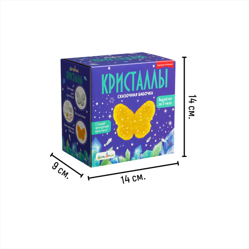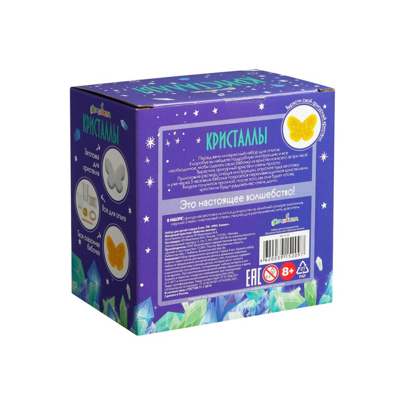 Создать фигурный кристалл совсем несложно. В наборе есть все необходимое для безопасного опыта, а также подробная инструкция на русском языке. Для того чтобы создать сказочную бабочку, вам нужно приготовить раствор, следуя инструкции, затем опустить туда гипсовую заготовку и подождать. Уже через три часа у вас получится прочный фигурный кристалл, который будет радовать вас очень долго. Наслаждайтесь результатом! Откуда прилетела эта бабочка? Наверняка из волшебной страны! Сияющая желтая бабочка станет как отличным украшением для комнаты, так и необычным подарком.