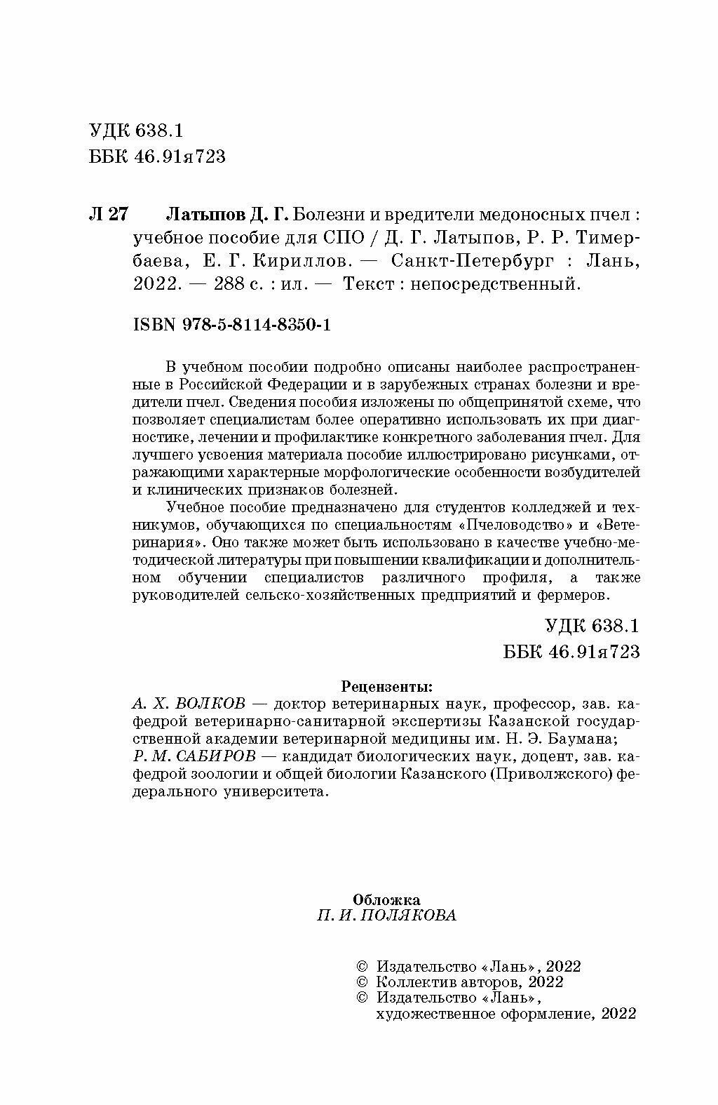 Болезни и вредители медоносных пчел (Латыпов Далис Гарипович, Тимербаева Разалия Рустамовна, Кириллов Евгений Геннадьевич); Лань, 2022