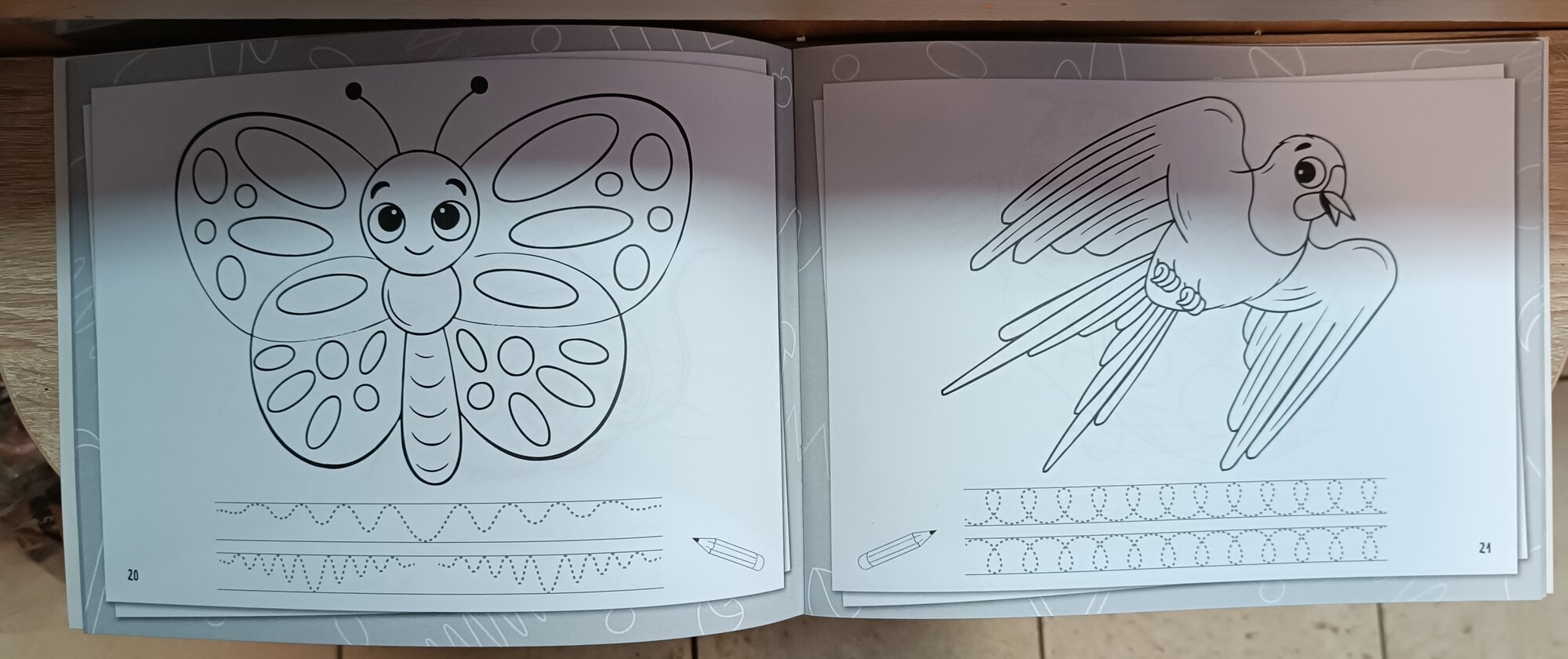 "Моя первая раскраска-пропись" состоит из 24 листов, содержащих 48 иллюстраций, соединённых скрепкой.