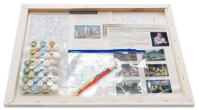 | Комплектация | Холст на подрамнике с пронумерованной схемой, Контрольный лист, Набор акриловых красок, Кисти – 4 шт., Крепление для готовой картины, Пакет с zip-застежкой 23 х 17,5 см, Листовка о художнике, Сувенирный магнит |