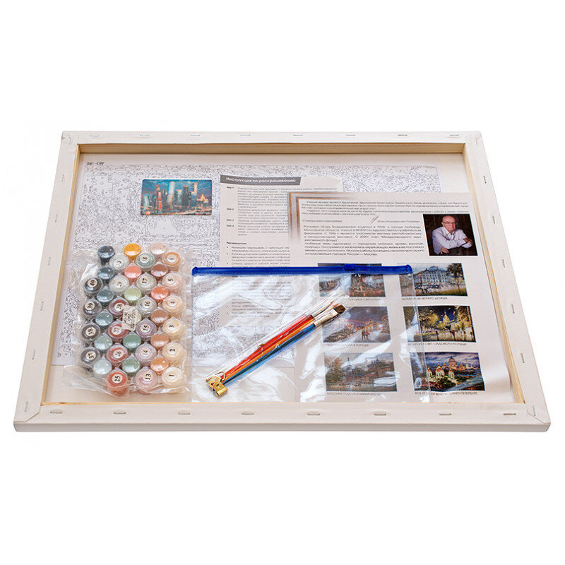 | Комплектация | Холст на подрамнике с пронумерованной схемой, Контрольный лист, Набор акриловых красок, Кисти – 4 шт., Крепление для готовой картины, Пакет с zip-застежкой 23 х 17,5 см, Листовка о художнике, Сувенирный магнит |