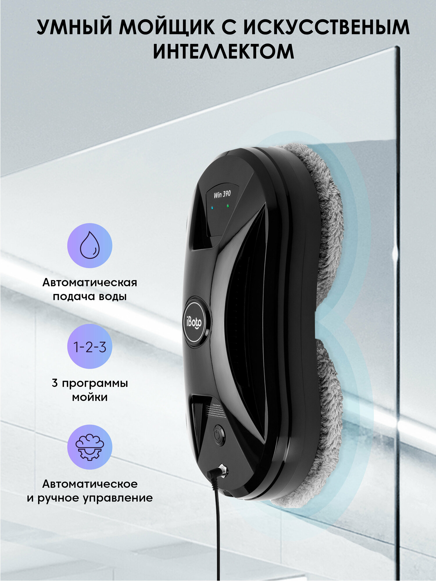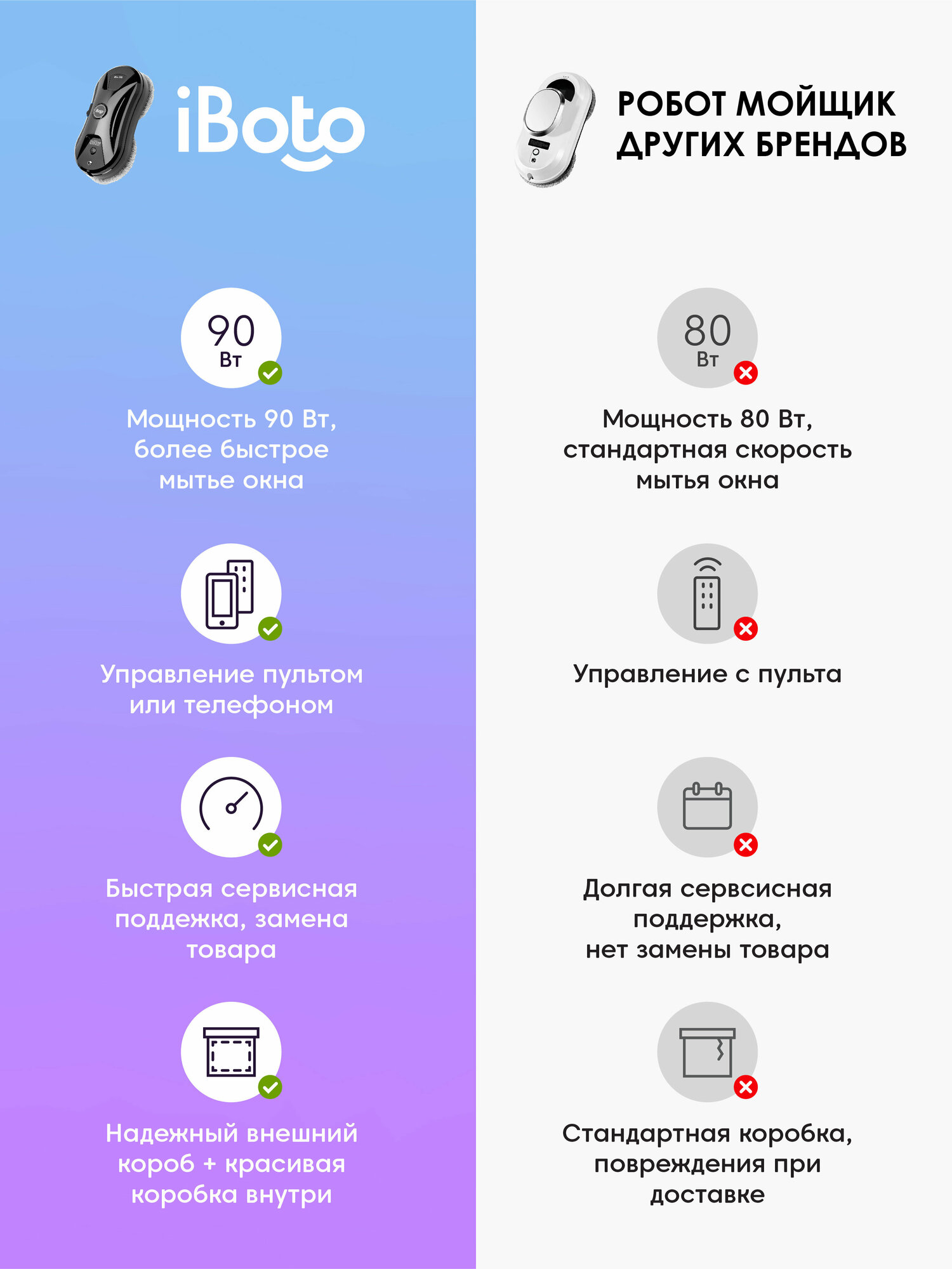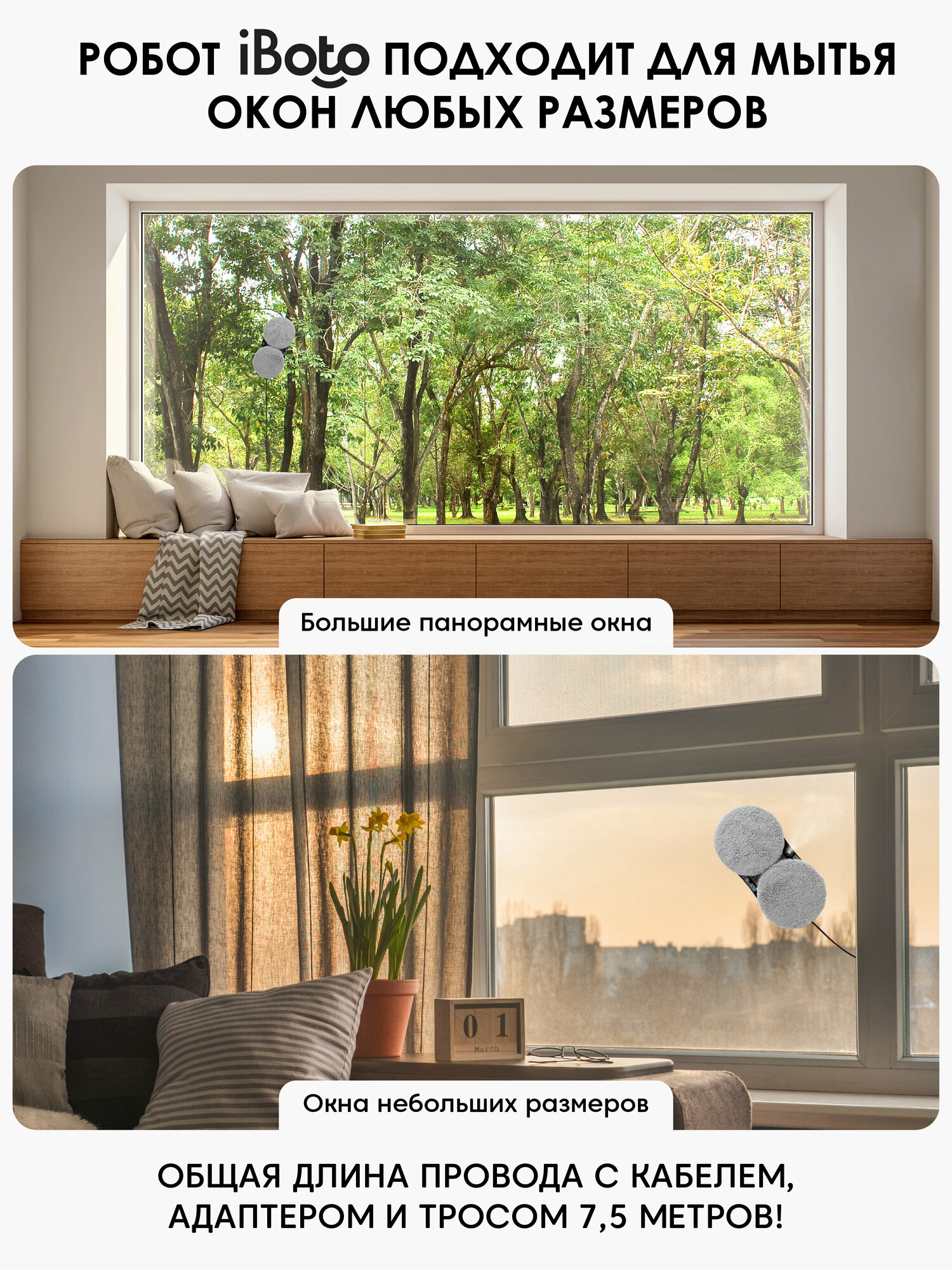 Умный Робот Мойщик окон с Автоматическим распылением iBoto отспециализированного на робототехнике бренда iBoto – это Идеальный Робот Мойщик,чтобы экономить вам время и деньги на мытье окон, безопасно мыть любуювертикальную и горизонтальную поверхность в квартире или доме: окна, зеркала,стекло, плитку, кафель, фасад дома и многое другое, не оставляя разводов, нецарапая и не повреждая поверхность! Робот стеклоочиститель будет прекраснымпомощником в решении проблемы безопасного мытья окон любого размера на высокихэтажах, сэкономит вам на клининге от 5000 в год!МОЩНОСТЬБлагодаря мощному мотору 90 Вт и функции автоматического распыления, пока вынаслаждаетесь жизнью, робот для мойки окон выполняет быструю и качественнуюуборку со скоростью мытья 4 мин/1 м2!ИСКУССТВЕННЫЙ ИНТЕЛЛЕКТ С помощью встроенного искусственного интеллекта и датчиков навигации, умныймойщик окон робот определяет край рамы, самостоятельно понимает необходимостьподачи воды, строит оптимальный маршрут и выполняет уборку в 3 режимах, неоставляя разводы на поверхности! Для идеальной мойки без разводов в комплектвходят 10 съёмных салфеток, которые во время работы прибора, необходимопериодически менять, салфетки сделаны из микрофибры, подходят для стирки вмашинке!УПРАВЛЕНИЕРобот для мытья окон легко управляется с помощью пульта дистанционногоуправления или мобильного приложения, что позволяет настраивать и задаватьрежимы его работы, без необходимости физического контакта, детальнаяинструкция, которая предоставляется к роботу полностью на русском языке!
