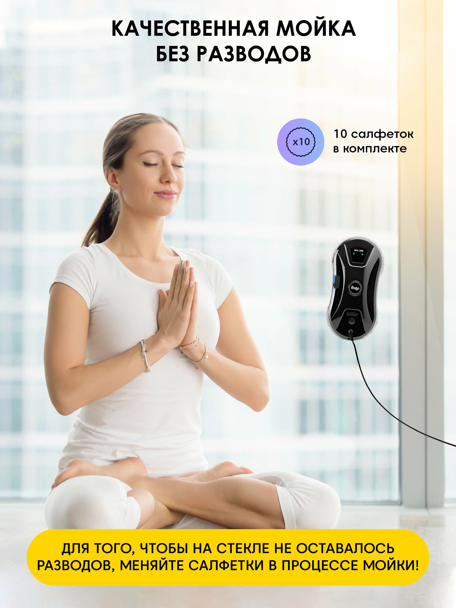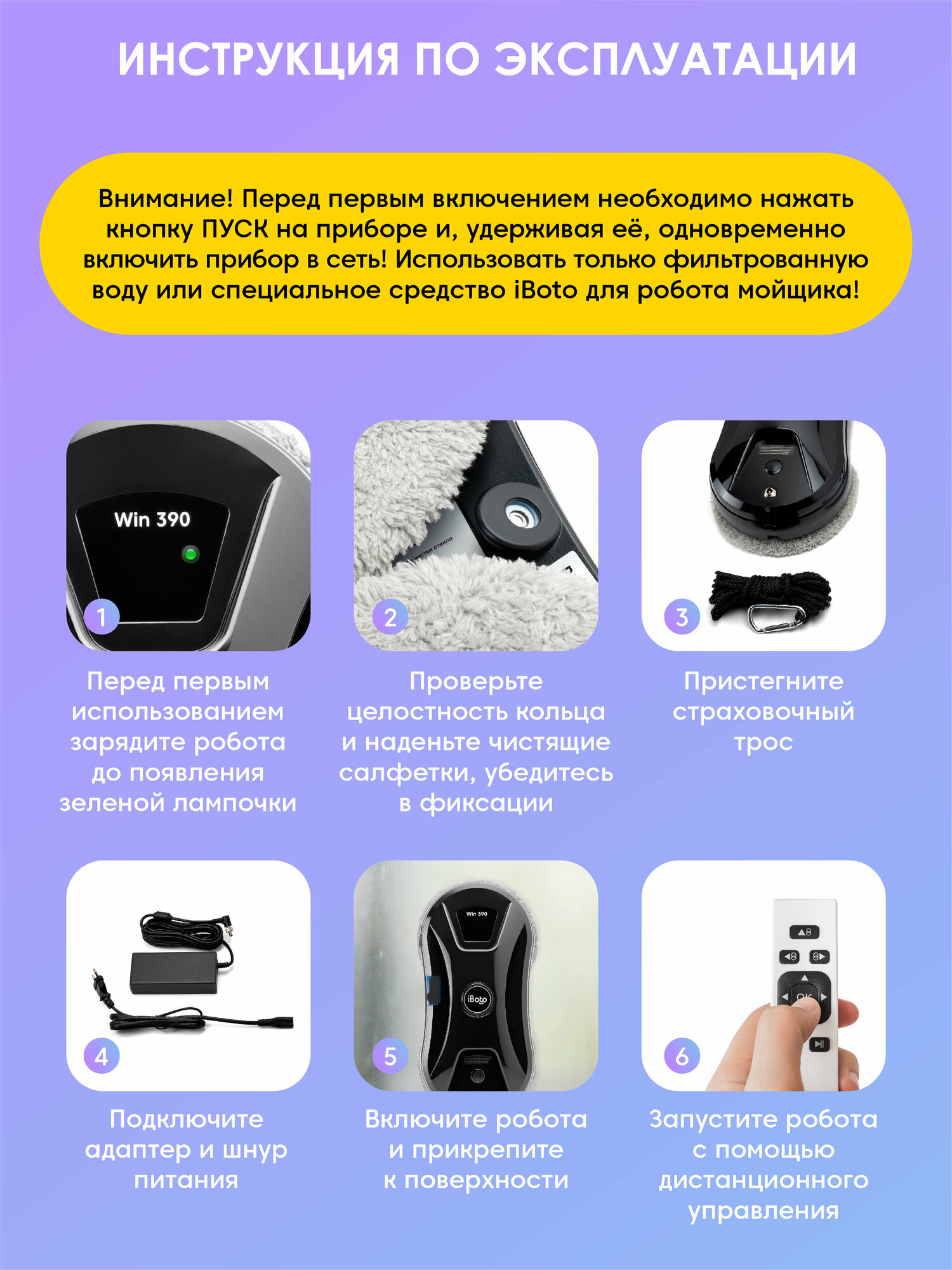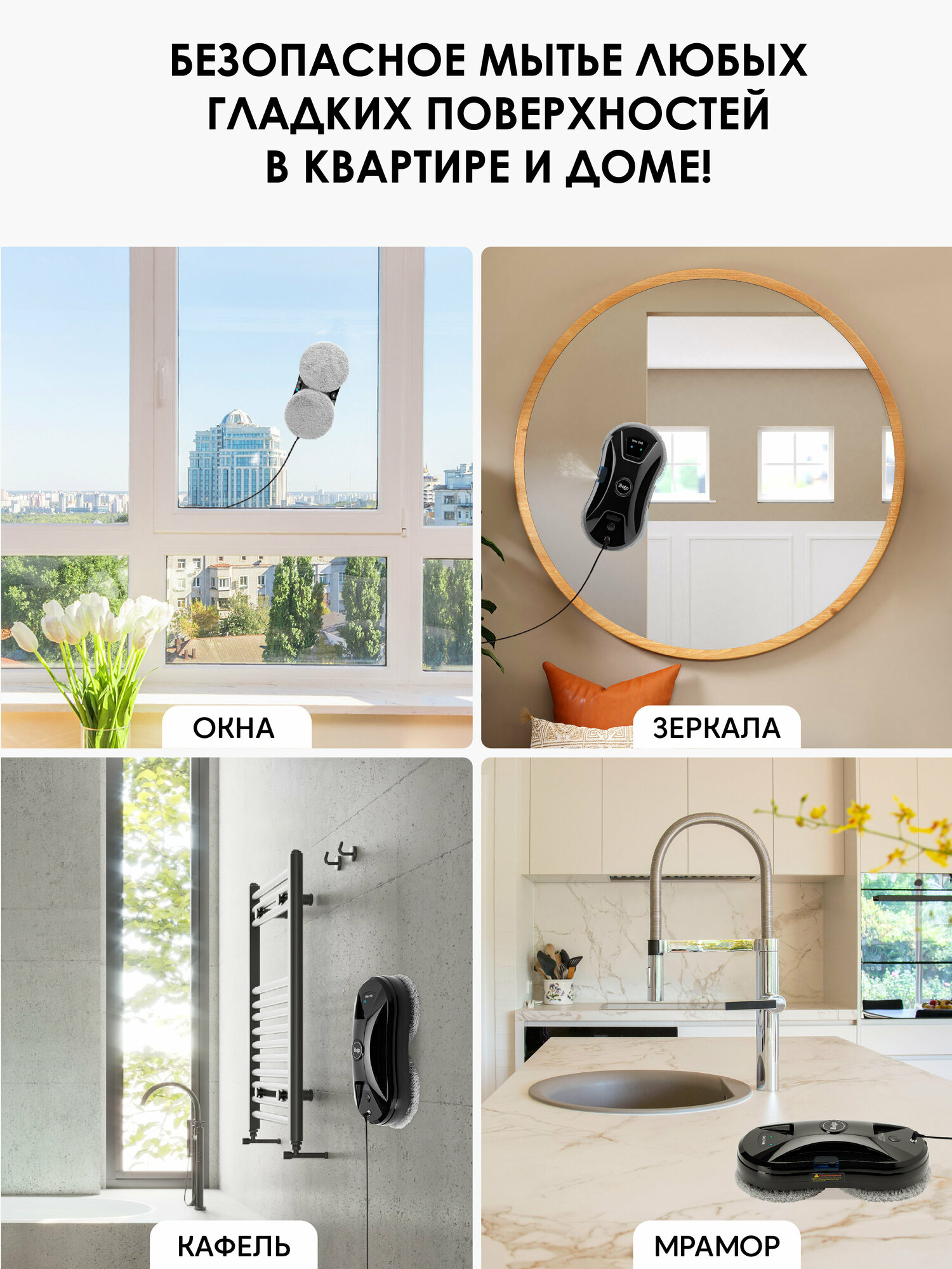 Умный Робот Мойщик окон с Автоматическим распылением iBoto отспециализированного на робототехнике бренда iBoto – это Идеальный Робот Мойщик,чтобы экономить вам время и деньги на мытье окон, безопасно мыть любуювертикальную и горизонтальную поверхность в квартире или доме: окна, зеркала,стекло, плитку, кафель, фасад дома и многое другое, не оставляя разводов, нецарапая и не повреждая поверхность! Робот стеклоочиститель будет прекраснымпомощником в решении проблемы безопасного мытья окон любого размера на высокихэтажах, сэкономит вам на клининге от 5000 в год!МОЩНОСТЬБлагодаря мощному мотору 90 Вт и функции автоматического распыления, пока вынаслаждаетесь жизнью, робот для мойки окон выполняет быструю и качественнуюуборку со скоростью мытья 4 мин/1 м2!ИСКУССТВЕННЫЙ ИНТЕЛЛЕКТ С помощью встроенного искусственного интеллекта и датчиков навигации, умныймойщик окон робот определяет край рамы, самостоятельно понимает необходимостьподачи воды, строит оптимальный маршрут и выполняет уборку в 3 режимах, неоставляя разводы на поверхности! Для идеальной мойки без разводов в комплектвходят 10 съёмных салфеток, которые во время работы прибора, необходимопериодически менять, салфетки сделаны из микрофибры, подходят для стирки вмашинке!УПРАВЛЕНИЕРобот для мытья окон легко управляется с помощью пульта дистанционногоуправления или мобильного приложения, что позволяет настраивать и задаватьрежимы его работы, без необходимости физического контакта, детальнаяинструкция, которая предоставляется к роботу полностью на русском языке!