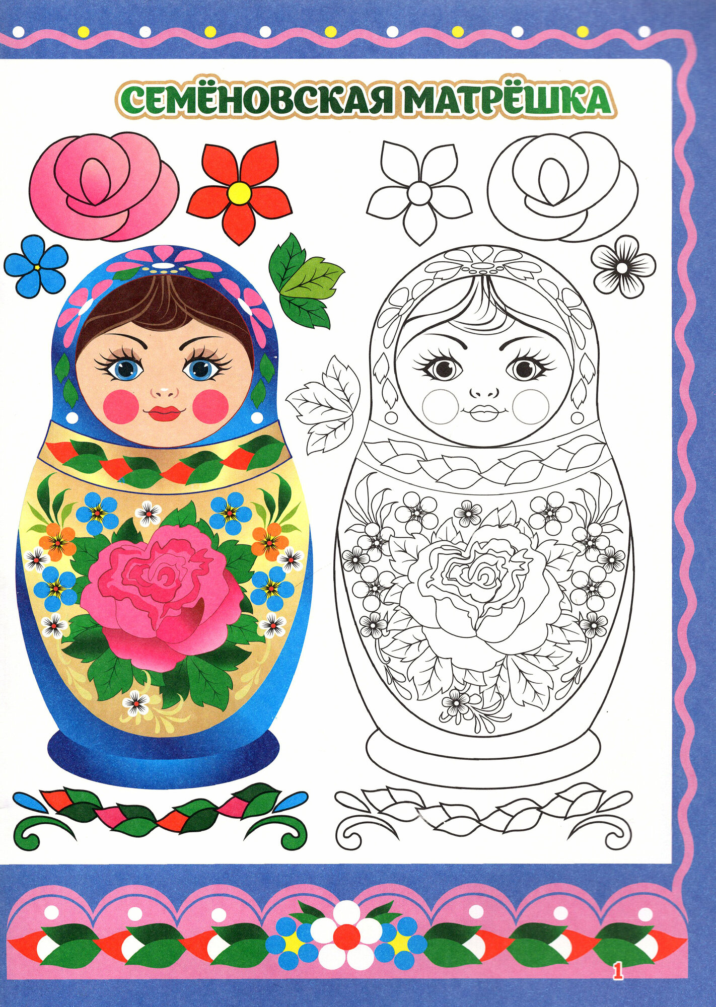 Книга представляет виды народной Семёновской, Дымковской, Хохломской, Гжельской, Жостовской, Палехской, Городецкой, Владимирской, Филимоновской росписи, которые на половину раскрашены, а на половину оставлены для раскрашивания ребёнка или взрослого, который хочет познакомиться с народными промыслами. Можно использовать как наглядный материал для занятий.