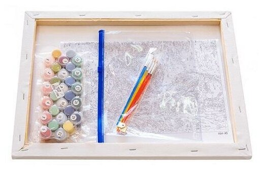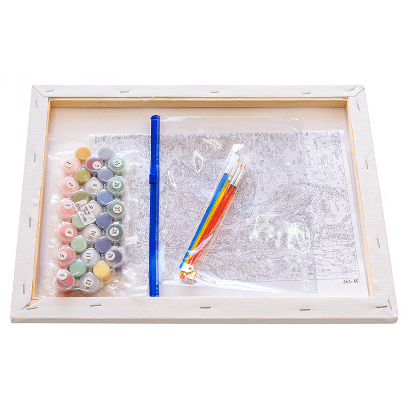 | Комплектация | Холст на подрамнике с пронумерованной схемой, Контрольный лист, Набор акриловых красок, Кисти – 4 шт., Крепление для готовой картины, Пакет с zip-застежкой 23 х 17,5 см; Листовка о художнике |