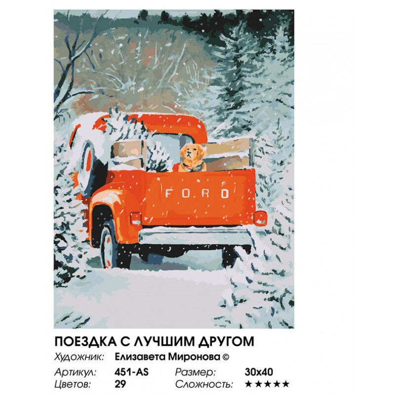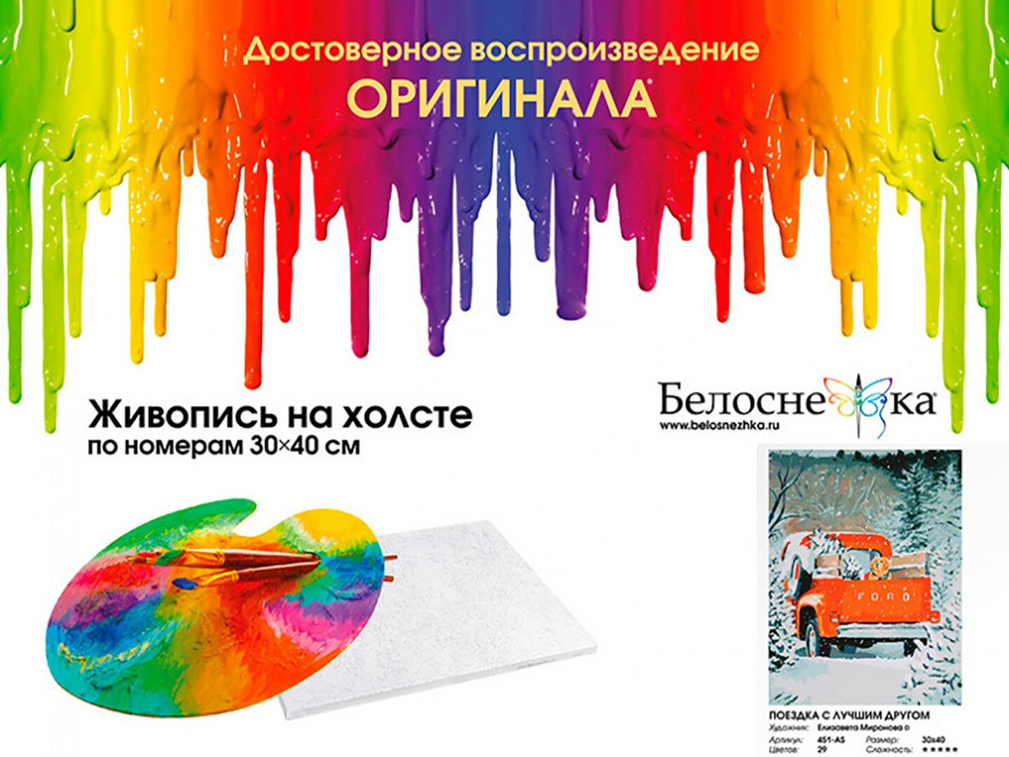 | Комплектация | Холст на подрамнике с пронумерованной схемой, Контрольный лист, Набор акриловых красок, Кисти – 4 шт., Крепление для готовой картины, Пакет с zip-застежкой 23 х 17,5 см; Листовка о художнике |