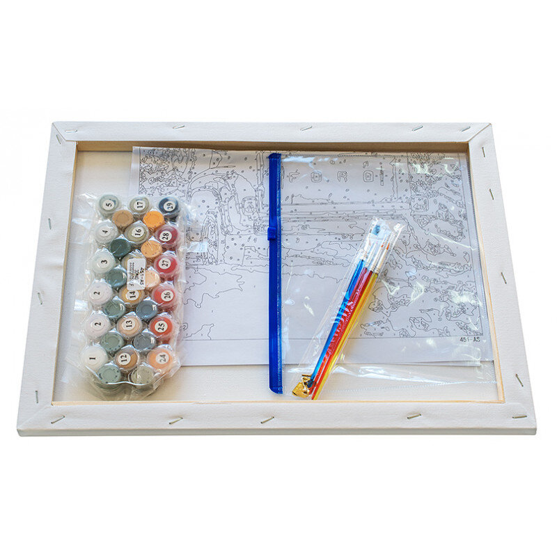 Рисуйте! Создавайте прекрасные сюжеты, станьте настоящим художником! С наборами Живопись на холсте это легко и просто, в комплекте есть все для работы над картиной на холсте. Просто возьмите стакан с водой и бумажную салфетку и время для творчества наступило. Размер 30х40 см. оптимальный для того чтобы получился красивый детализированный сюжет. Основа картины - хлопковый холст на деревянном подрамнике с напечатанной схемой изображения. Холст загрунтован и полностью готов к нанесению краски, акриловые краски на водной основе экологически безопасны, номера на баночках соответствуют номерам на схеме. Количество красок достаточное для раскрашивания картины, даже в 2 слоя.