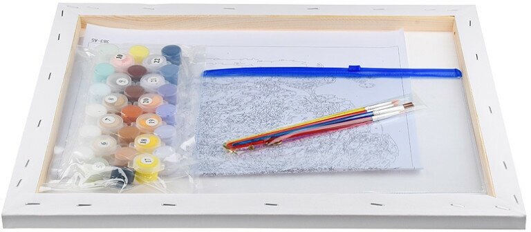 | Комплектация | Холст на подрамнике с пронумерованной схемой, Контрольный лист, Набор акриловых красок, Кисти – 4 шт., Крепление для готовой картины, Пакет с zip-застежкой 23 х 17,5 см; Листовка о художнике |