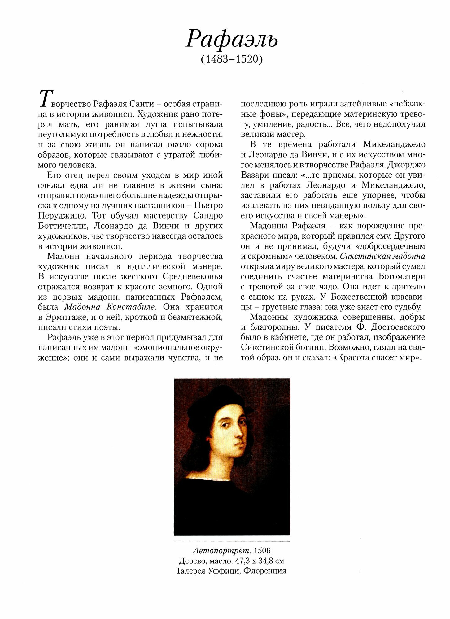 Сорок образов мадонн создал за свою жизнь великий итальянский художник Рафаэль. Он рано потерял мать, а потому все его героини были написаны в идиллической манере. «Сикстинская мадонна» открыла миру великого мастера, который сумел соединить счастье материнства с тревогой за своего Божественного сына. Он спасет мир, но мир будет к нему жесток.