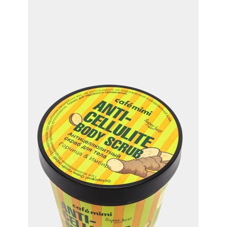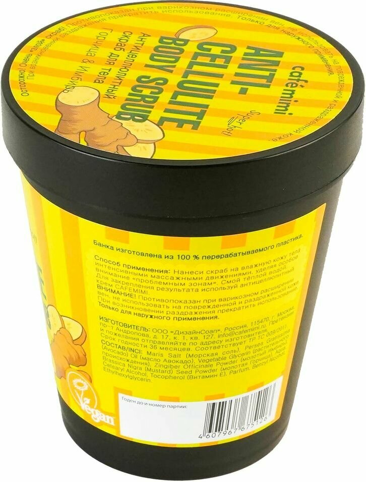 | Применение | нанеси скраб на влажную кожу тела интенсивными массажными движениями, уделяя особое внимание проблемным зонам. Смой тёплой водой. Для закрепления результата используй антицеллюлитный крем CAFEMIMI |
