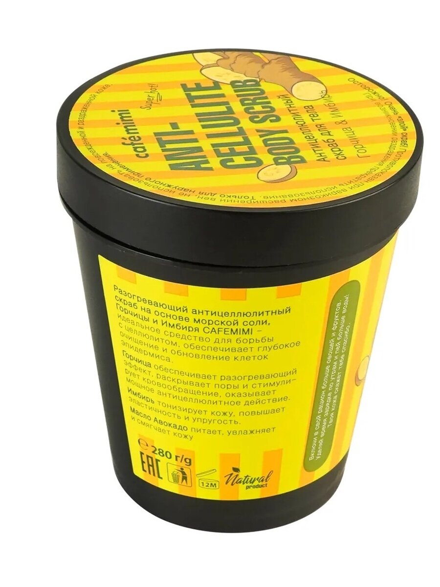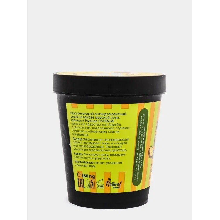 Разогревающий антицеллюлитный скраб на основе морской соли, Горчицы и Имбиря CAFEMIMI - идеальное средство для борьбы с целлюлитом, обеспечивает глубокое очищение и обновление клеток эпидермиса. Горчица обеспечивает разогревающий эффект, раскрывает поры и стимулирует кровообращение, оказывает мощное антицеллюлитное действие. Имбирь тонизирует кожу, повышает эластичность и упругость. Масло Авокадо питает, увлажняет и смягчает кожу.
