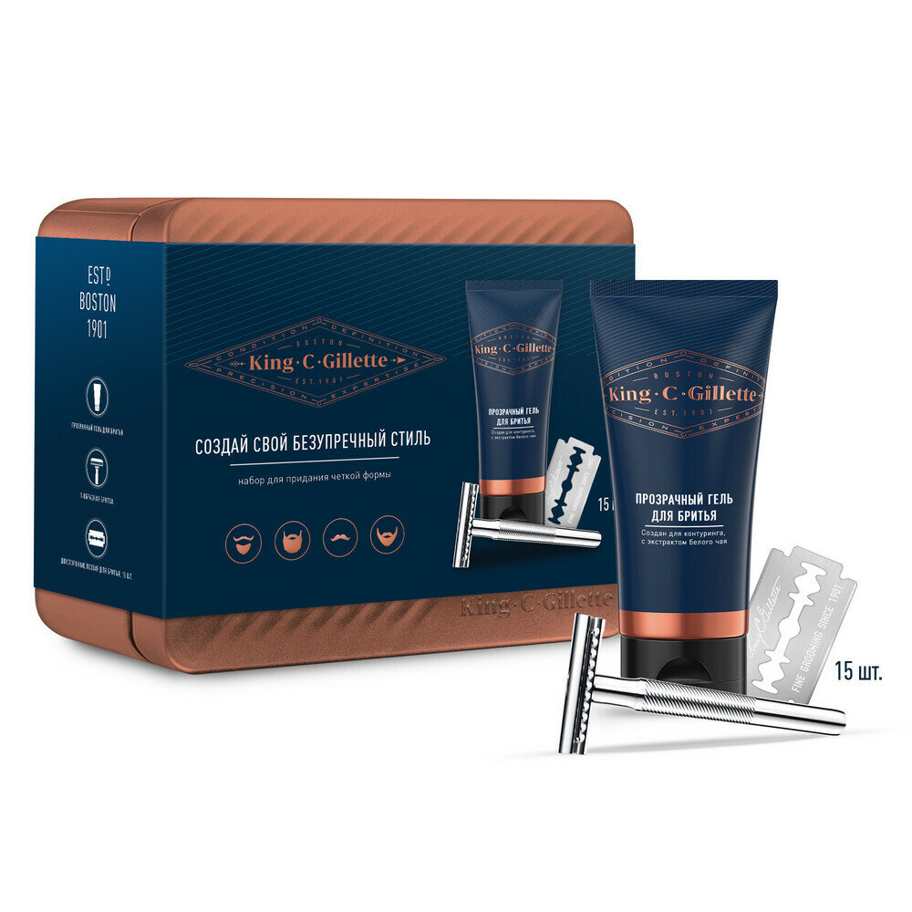 Создай свой безупречный стиль вместе с набором King C. Gillette для придания четкой формы бороде. Внутри – легендарная Т-образная бритва с закрытым гребнем и хромированным покрытием, 15 двусторонних лезвий с платиновым покрытием и прозрачный гель для бритья с экстрактом белого чая 150 мл для точного контуринга в металлической коробке.