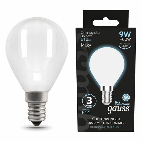 Упаковка - 10 штук. Цоколь Е14. Светодиодные лампы по технологии Филамент.Высокий индекс цветопередачи, близкий к естественному солнечному свету - цвета выглядят насыщенными и яркими.Идеально подойдут, если вам нужно решение максимально приближенное к естественному свету и лампам накаливания.Красиво и приятно смотрятся в открытых плафонах. А с хрустальными и сложными плафонами и стеклянными элементами наполняют комнату приятным мягким светом и красивыми бликами.Светодиодные филаментные лампы GAUSS - это новейшие технологии в светотехнике. Лампы имеют привычный вид классических ламп накаливания, освещают пространство на 360о и дают больше света по сравнению с обычными светодиодными лампами за счет прозрачной колбы. Идеально подходят для хрустальных люстр и открытых светильников, а также для реализации дизайнерских решений, где важен вид классических ламп накаливания