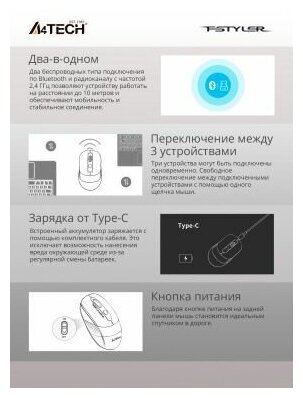 Мышь беспроводная A4Tech Fstyler FB10C обладает компактными размерами и универсальной формой, подходящей для работы как правой, так и левой рукой. Модель оборудована встроенным аккумулятором, который заряжается от любого порта USB-A при помощи кабеля Type-C, предусмотренного в комплекте. Светодиодный индикатор дает понять, когда уровень заряда опускается ниже 25%. Удобное колесо прокрутки работает плавно и без рывков. Рядом с ним находится кнопка переключения между 4 режимами чувствительности датчика, максимальное разрешение которого составляет 2400 dpi. Мышь беспроводная A4Tech Fstyler FB10C поддерживает подключение через Bluetooth или USB-приемник, при этом у модели предусмотрена возможность синхронизации с несколькими устройствами. В нижней части корпуса расположена кнопка смены режимов подключения с индикатором. Для безопасной транспортировки мышь можно выключить. Корпус модели выполнен из прочного пластика с прорезиненной полосой синего цвета, которая выполняет декоративную и противоскользящую функции.