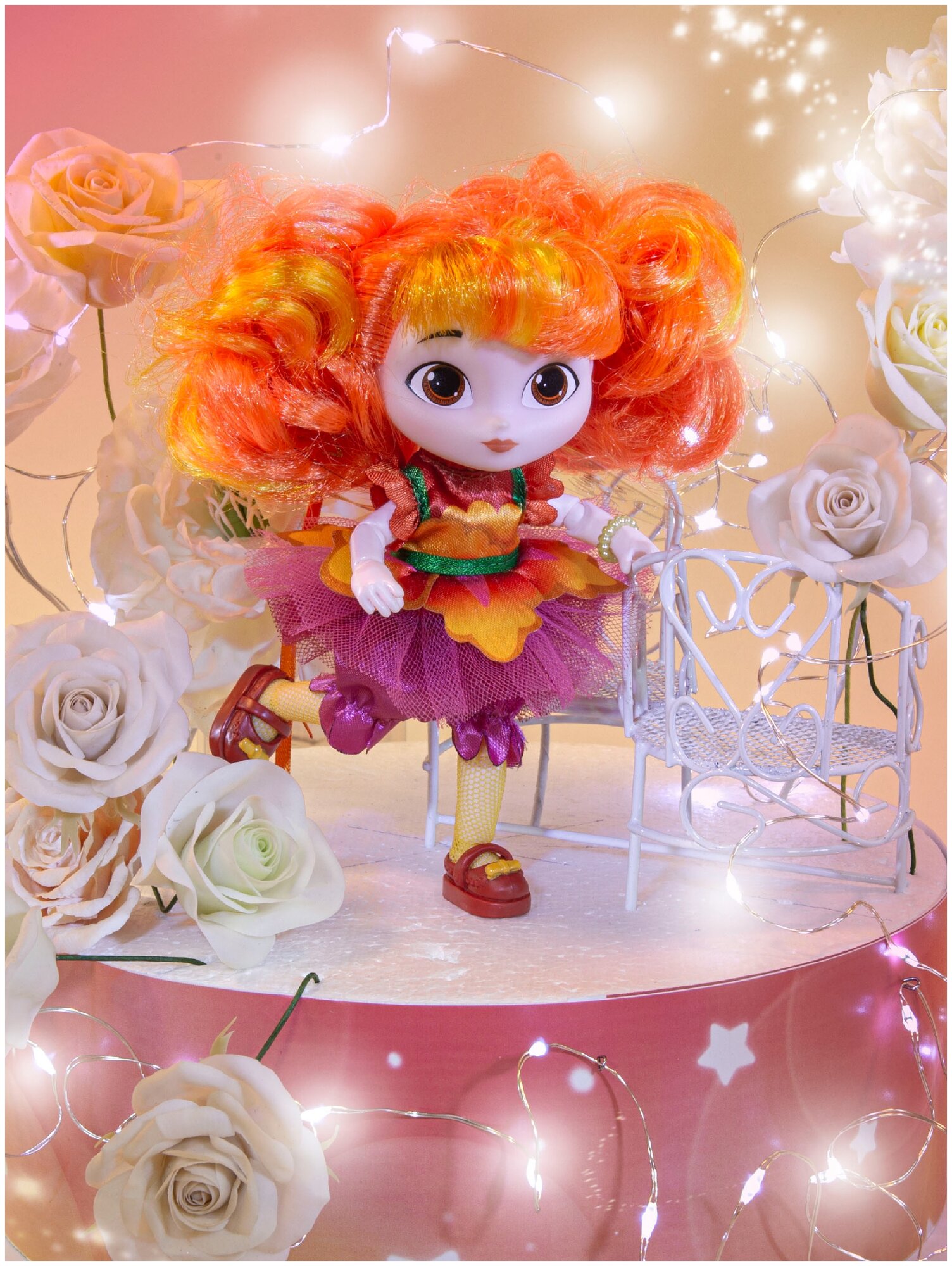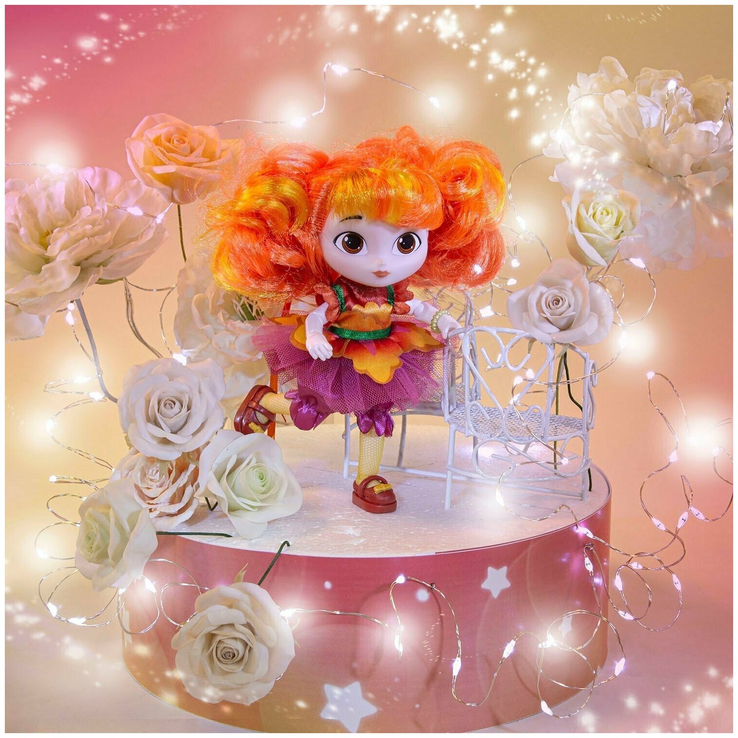 Эти сказочные малышки украсят собой любую кукольную компанию. Фея Алёнка одета в пышное платьице, колготки и ботиночки. На спине у феи - нежные крылышки. Раскладная подставка для эффектных фотосессий в комплекте. Высота куклы 13 см. Полетели в сказку вместе!