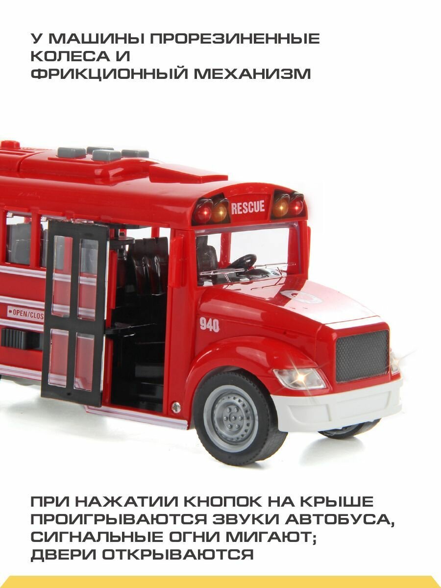 Автобус фрикционный имеет современный дизайн, соответствующий реальным аналогам транспорта. Игрушка выполнена из качественных материалов. Машинка, имеет звуковые и световые эффекты. Собери свой автопарк с коллекцией машинок.