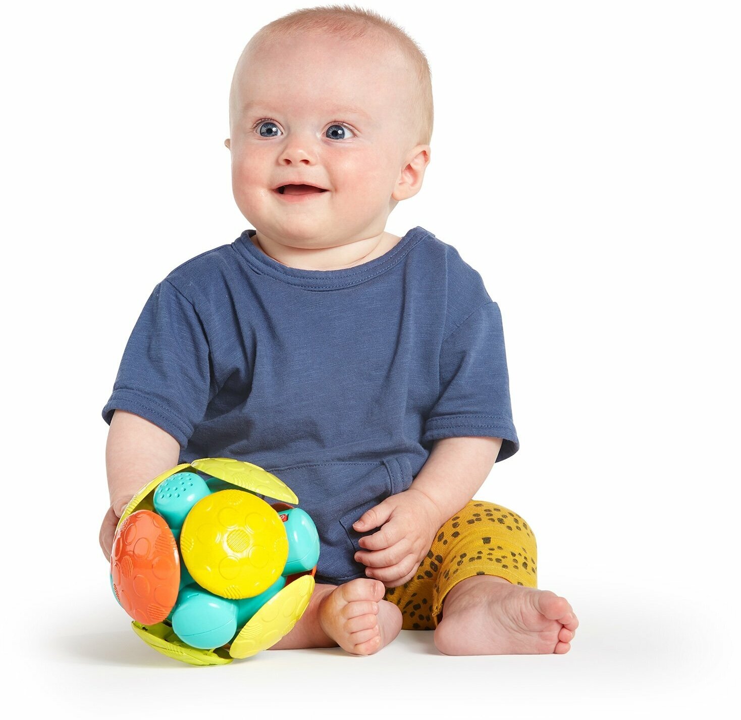 Эта игрушка сделана с уникальной ребристой текстурой, чтобы малыш смог крепко держался за нее. Когда мяч катится, каждый поворот вызывает у ребенка приступ хихиканья. Игрушка прекрасно подходит для активного веселья.