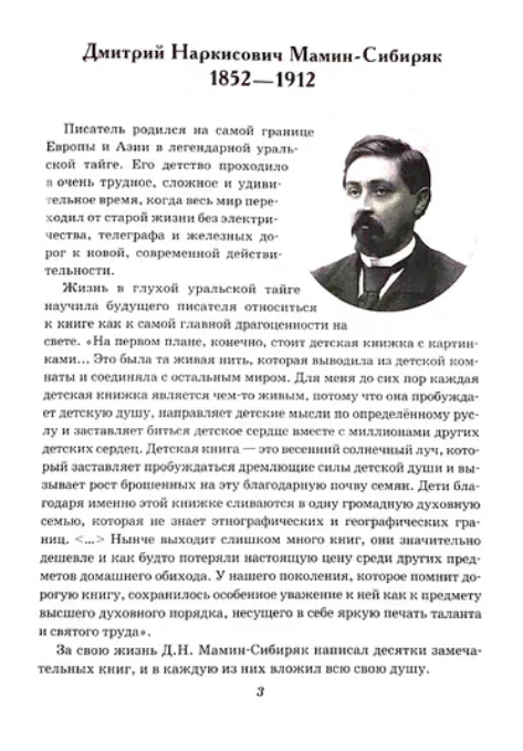 Ребёнка решили познакомить с творчеством Мамина-Сибиряка из-за того, что эти рассказы знакомы нам самим с детства. Кстати, имеются прекрасные советские мультфильмы по этим рассказам (для тех, кто любят сначала прочитать, а потом посмотреть экранизацию произведений)! Содержанием книги очень довольны. Текст богатый, насыщенный смысловым содержанием, но понятен и доступен для ребёнка! Имеются репродукции картин Шишкина (какие же живописные, по-настоящему "живые" у него картины, сын их очень внимательно рассматривал), картин Волкова и др. русских художников. Главное, что сама книга учит ребёнка доброте, развивает чувство эмпатии, художественные чувства. Пусть книга вышла в небольшом формате (вообще, может быть это даже её преимущество, но, кому, конечно, как нравиться), но однозначно достойна, того чтобы быть прочитанной!