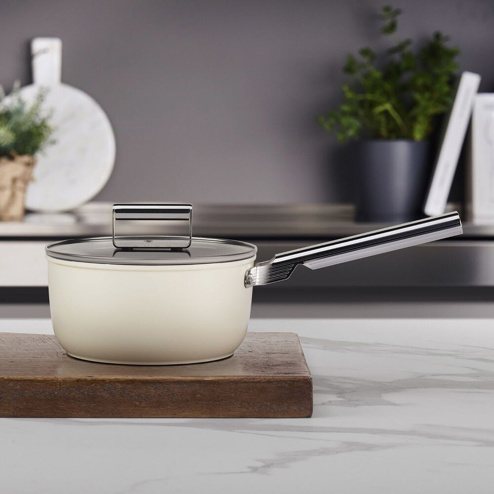 Кремовый сотейник с крышкой Smeg с элегантным плавным корпусом, аккуратной стеклянной крышкой и изящной стильной ручкой станет превосходным дополнением вашей кухонной коллекции посуды. Как и другая посуда линейки Smeg, сотейник изготовлен из высококачественного кованого алюминия, благодаря чему отличается высокой прочностью и устойчив к любым деформациям, а кроме того, обеспечивает быстрое и равномерное нагревание в процессе приготовления пищи. Еще одна особенность данной модели — толстое дно с 3-слойным антипригарным покрытием с керамическими частицами. За счет сцепления с алюминием такое покрытие максимально устойчиво к сильным ударам, сколам и повреждениям. Диаметр сотейника 20 см и объем 2,7 л рассчитаны на приготовление нескольких порций пищи. Благодаря высокой жаропрочности сотейник можно использовать в духовом шкафу при температуре до 250 °C. А кроме того, его можно мыть в посудомоечной машине и применять на разных типах плит — газовых, индукционных, стеклокерамических и электрических. Наличие эргономичной ручки, сделанной из гладкой полированной стали, позволяет использовать сотейник с максимальным удобством и не обжечь руки. Эстетичный и элегантный, сотейник Smeg всегда будет радовать вас своим безупречным стилем. Ключевые особенности: Стильный дизайн: сотейник Smeg CKFS2011 с элегантным плавным корпусом, аккуратной стеклянной крышкой и изящной стильной ручкой станет превосходным дополнением вашей кухонной коллекции посуды. Сотейник с крышкой CKFC2611 идеально подойдет для приготовления или разогрева разнообразных блюд. Сотейник отличается высокой жаропрочностью, выдерживая самые большие температуры в духовке до 250 °C. Антипригарное покрытие: 3-слойное антипригарное покрытие с керамическими частицами максимально устойчиво к сильным ударам, сколам и повреждениям. Удобный размер: благодаря диаметру 20 см в сотейнике можно приготовить любую пищу. Сотейник CKFS2011 можно мыть в посудомоечных машинах, а также использовать на всех типах плит — газовых, индукционных, стеклокерамических и электрических.