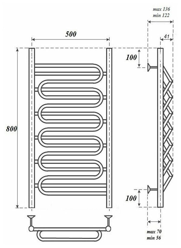 | ВКоробке | Полотенцесушитель - 1 шт. Комплект креплений - 1 шт. Комплект декоративных заглушек - 1 шт. Кран Маевского - 1 шт. Инструкция - 1 шт. |