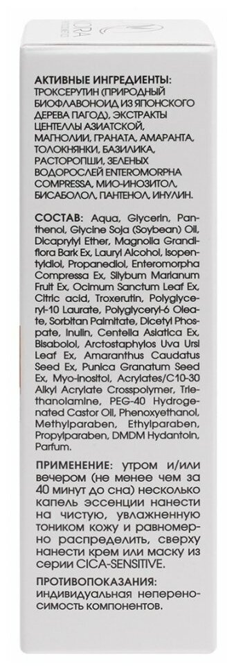 Состав: Aqua, Glycerin, Panthenol, Glycine Soja (Soybean) Oil, Dicaprylyl Ether, Magnolia Grandiflora Bark Extract, Lauryl Alcohol, Isopentyldiol, Propanediol, Enteromorpha Compressa Extract, Silybum Marianum Fruit Extract, Ocimum Sanctum Leaf Extract, Citric аcid, Troxerutin, Polyglyceryl-10 Laurate, Polyglyceryl-6 Oleate, Sorbitan Palmitate, Dicetyl Phospate, Inulin, Centella Asiatica Extract, Bisabolol, Arctostaphylos Uva Ursi Leaf Extract, Amaranthus Caudatus Seed Extract, Punica Granatum Seed Extract, Myo-inositol, Acrylates/C10-30 Alkyl Acrylate Crosspolymer, Triethanolamine, PEG-40 Hydrogenated Castor Oil, Phenoxyethanol, Methylparaben, Ethylparaben, Propylparaben, DMDM Hydantoin, Parfum.