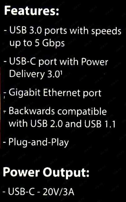 | Особенности | Док-станция с разъемом USB Type-C, 3 портами USB 3.0, 1 портом USB Type-C/PD 3.0 и 1 портом Gigabit Ethernet |
