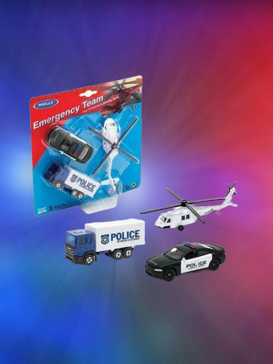 Игровой набор с 3 транспортными средствами полицейской команды – вертолет, полицейская легковая машина и грузовая машина. Модели представлены в единой бело-сине-черной цветовой гамме с отличной детализацией, принтованными элементами на кузовах, подвижными деталями (винт вертолета, колеса).