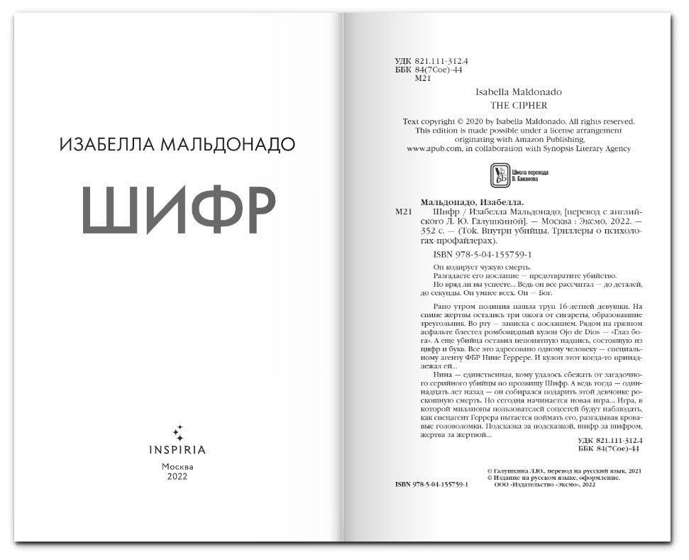 Книга: Шифр (Изабелла Мальдонадо); Эксмо, Inspiria, Редакция 1, 2023