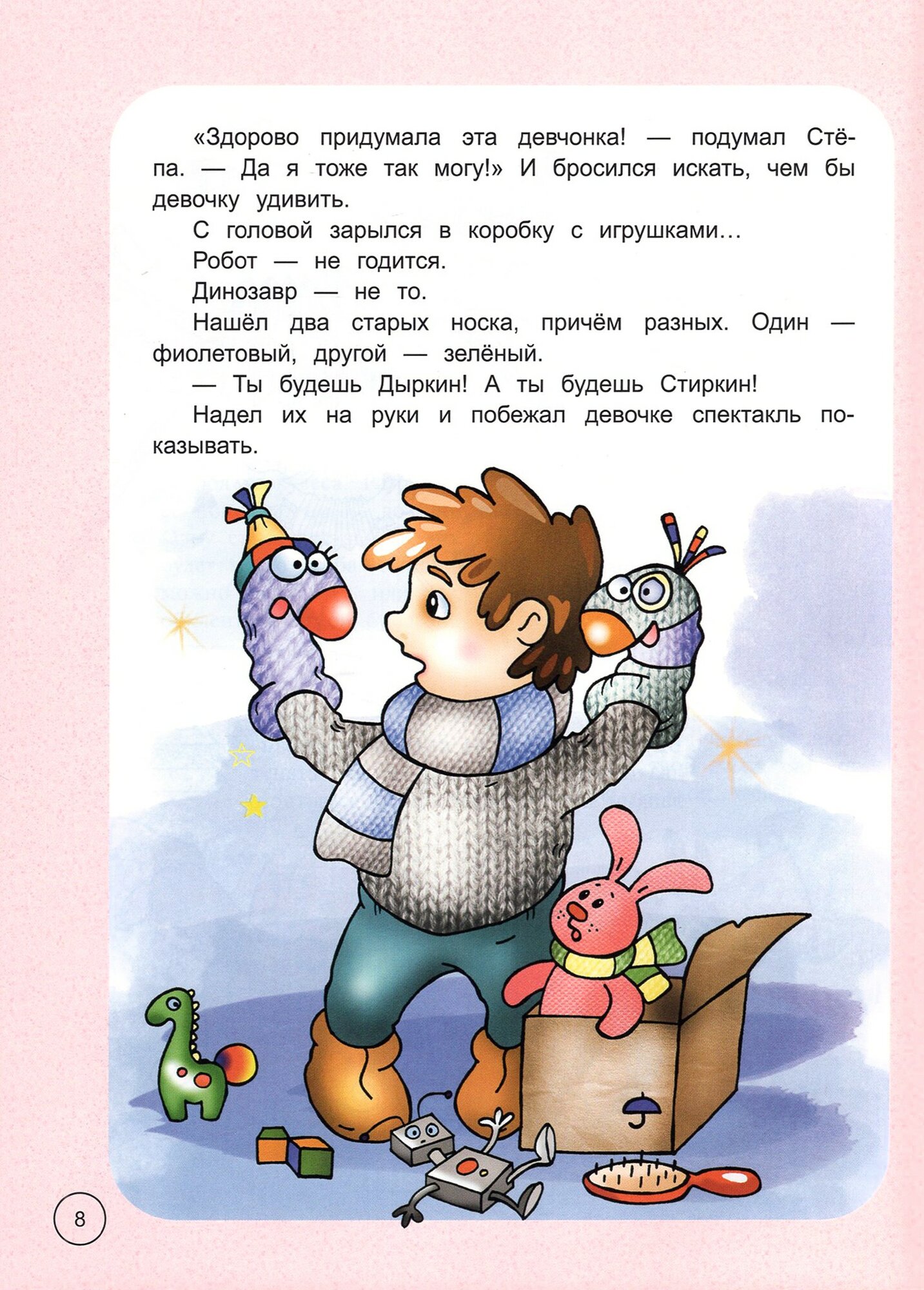 Незабываемые приключения смешных Дыркина и Стиркина не оставят равнодушными никого, даже родителей)) А уж оформление! Лучше не бывает! Мелованная бумага, яркие иллюстрации на страницах с разноцветными полями , озорные персонажи Валентины Дёгтевой кажется вот-вот спрыгнут со страниц и начнут разворачивать театральное действо прямо у тебя под носом! В общем, вся семья в восхищении от приобретения!!!