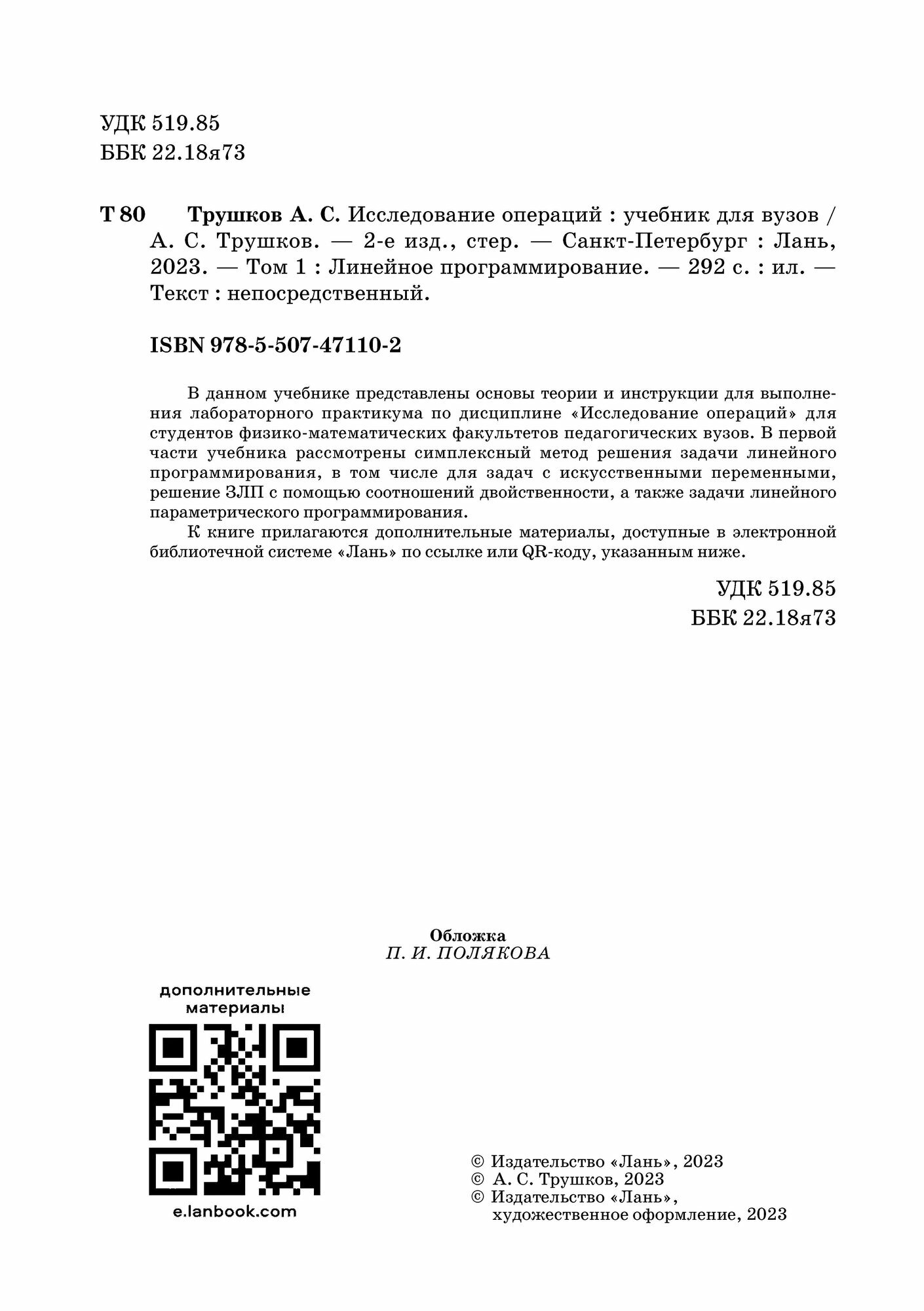 Исследование операций. Том 1. Линейное программирование. Учебник для вузов (Трушков Александр Сергеевич); Лань, 2022