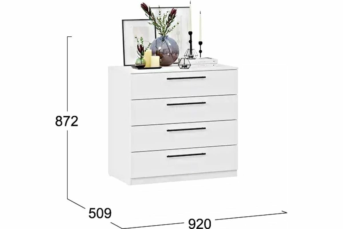Набор мебели для спальни «» выделяется правильными формами, современными материалами и дизайном модулей с минимальным сбалансированным декором, который придаст помещению стилистическое единство. характеристики:• Каркас и фасад: ЛДСП с кромкой ПВХ;• Декор: «Белый» ЛДСП с тиснением "поры дерева";• Фурнитура: шариковые направляющие, черные матовые ручки металл/пластик.Размеры:- Габаритная высота 88 см;- Габаритная глубина 51 см;- Габаритная ширина 92 см.основные преимущества модели:• Комод станет оптимальным решением для хранения текстиля в спальне. Модель оснащена четырьмя вместительными ящиками, которые позволят без проблем вместить все необходимое.• Набор мебели для спальни «» включает в себя всё, что необходимо для создания уюта. Она придаст любой спальне утонченности и легкости, добавив комнате удобства ифункциональности.* Поставляется в разобранном виде. * Количество упаковок - 1 шт.