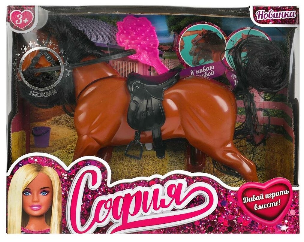 Гнедой жеребец с чёрной вьющейся гривой и хвостом, который умеет кивать головой и ржать как настоящая лошадь, непременно понравится маленькой принцессе. В комплект с лошадью входит седло и расчёска. С такой интересной игрушкой девочка сможет отправить любимую куклу на конную прогулку и придумать еще много новых сюжетов для игр.