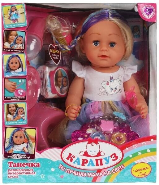 Милая кукла с детально проработанным личиком обязательно понравится малышке. Танечка одета в нарядное платье с пышной юбкой из разноцветного фатина. Одежда легко снимается и надевается. У куклы длинные красивые волосы, которые легко расчёсывать и укладывать в разнообразные причёски по своему желанию, для этого в наборе имеется расческа, резиночки и заколки.