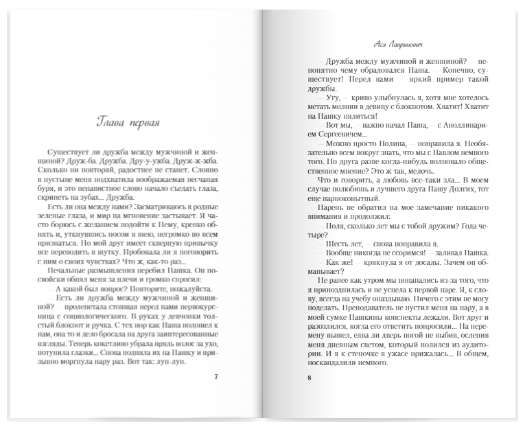 Доброго времени суток. Хочу написать рецензию на книгу Аси, но, для тех, у кого нет возможности читать и вчитываться в мои комментарии, скажу, что книга замечательная. Ее советую всем. Я люблю Асю за её интересные истории, простой, понятный для чтения язык. Ее любовные истории - это книги на один вечер, ведь оторваться от них, практически, невозможно, т.к. ты быстро погружаешься в атмосферу героев. Мне очень понравилось оформление книги, да и в общем, всех ее книг. Очень органичные и изящные обложки. Читать книги Аси Лавринович - это наслаждение и отдых от каких-то тяжёлых книг, например: «Мастер и Маргарита», либо от каких-то сложных периодов в жизни, которые есть и бывают у всех. Считаю, что у книголюба на полках должны стоять книги от этого автора, а также, тем, у кого “нечитун”, помогут выйти из этого состояния.