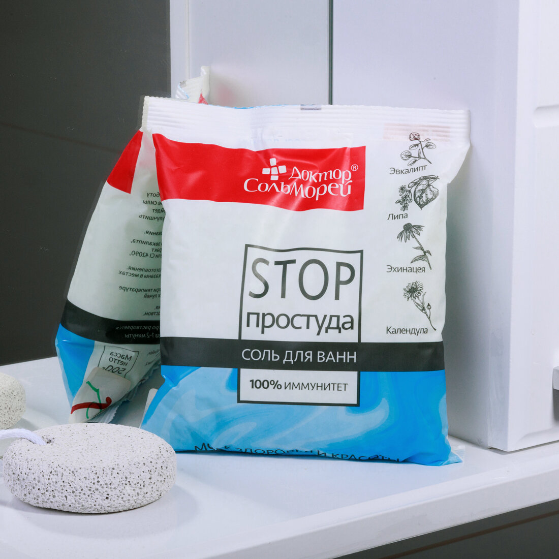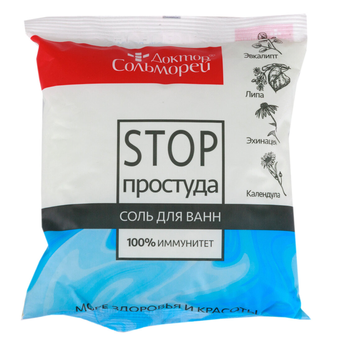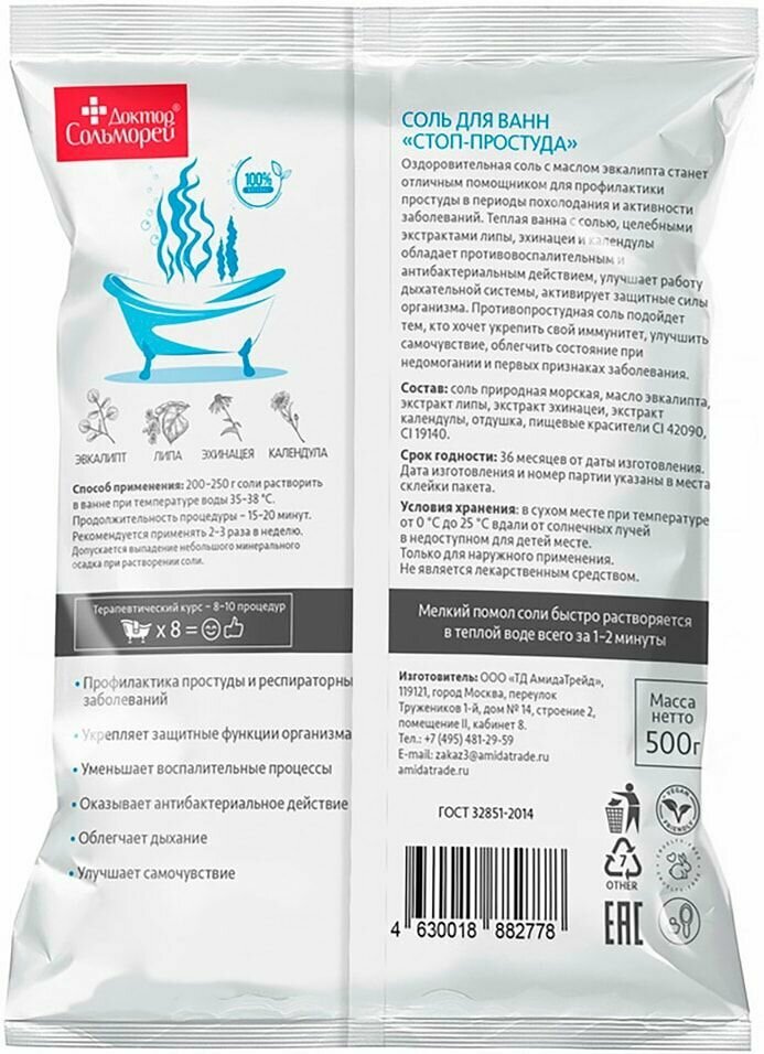 Форма выпуска и упаковка Соль для ванн 500,0 в пакете .Состав соль природная морская, масло эвкалипта, экстракт липы, экстракт эхинацеи, экстракт календулы, отдушка, пищевые красители CI 42090, CI 19140.Описание Бренд Доктор Сольморей Доктор Сольморей соль для ванн «стоп-простуда» Оздоровительная соль с маслом эвкалипта станет отличным помощником для профилактики простуды в периоды похолодания и активности заболеваний. Теплая ванна с солью, целебными экстрактами липы, эхинацеи и календулы обладает противовоспалительным и антибактериальным действием, улучшает работу дыхательной системы, активирует защитные силы организма. Противопростудная соль подойдет тем, кто хочет укрепить свой иммунитет, улучшить самочувствие, облегчить состояние при недомогании и первых признаках заболевания. Результат: Профилактика простуды и респираторных заболеваний Укрепляет защитные функции организма Уменьшает воспалительные процессы Оказывает антибактериальное действие Облегчает дыхание Улучшает самочувствиеПоказания Взрослым для принятия ванн.Противопоказания индивидуальная непереносимость отдельных компонентов.Способ применения и дозы 200-250 г соли растворить в ванне при температуре воды 35-38 °С. Продолжительность процедуры - 15-20 минут. Рекомендуется применять 2-3 раза в неделю. Терапевтический курс - 8-10 процедур. Допускается выпадение небольшого минерального осадка при растворении соли.Температура хранения от 5℃ до 25℃