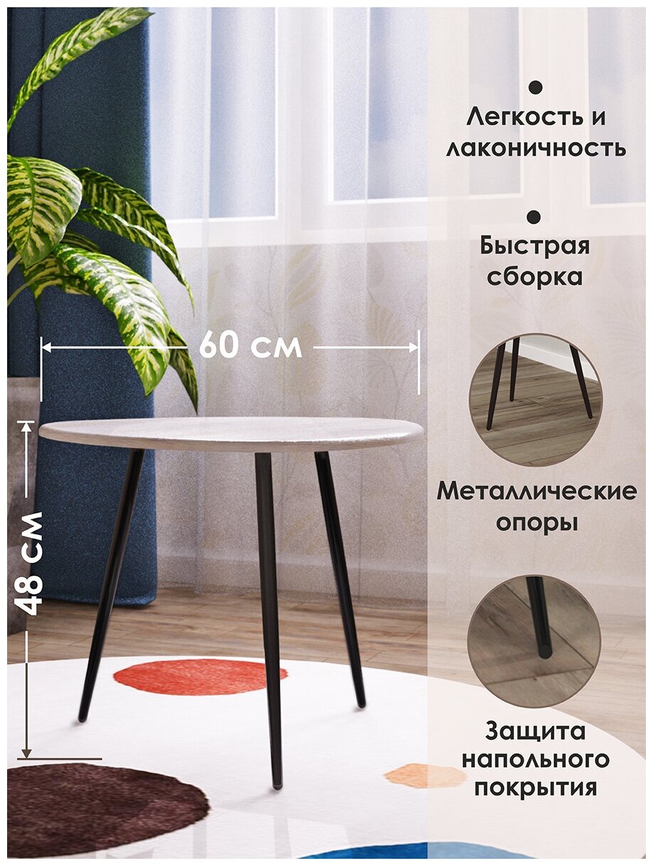 Журнальный столик выполнен в современном стиле, сочетающем оригинальную текстуру декоративного покрытия столешницы и металлического подстолья в цвете чёрный муару. Конструкция сборная.