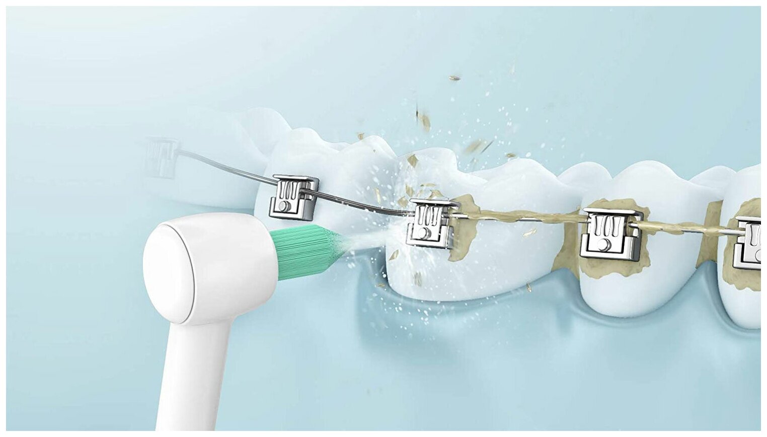 Чистка 2-в-1 с подачей струи воды и специальной щеткой! Наконечник разработан для оптимизации водного потока, сохраняя при этом преимущества плотной щетины, удаляющей налет вокруг стоматологических устройств. Он оснащен монопучковой щеткой, популярной у пациентов с ортодонтическими и ортопедическими конструкциями, несъемными конструкциями (мосты, брекеты, протезы и т.д.). Благодаря своей конусообразной форме без труда достигает узких промежутков между брекетами и зубами, около колец и дуги, обеспечивая полную очистку. Струя воды вымывает остатки пищи с помощью мощного точечного выброса.