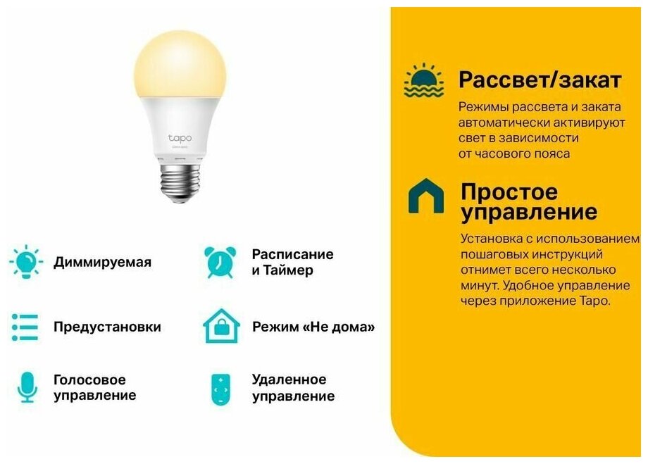 Умная Wi-Fi лампа. Диммируемая — удобная регулировка яркости для создания идеальной домашней атмосферы в любое время. Предустановки — подобрали идеальное освещение для просмотра фильмов? Сохраните его на будущее. Расписание — включение/выключение на заданной яркости в нужное время.