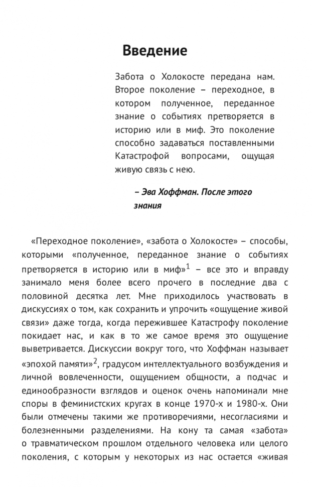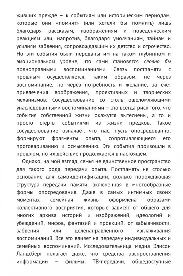 Возможно ли помнить не свое, а чужое прошлое? Как историческая травма влияет на жизнь тех, кто не был современником катастрофических событий? Марианна Хирш исследует глубинные механизмы передачи памяти о Холокосте через поколения, используя обширный материал послевоенной культуры - искусства, литературы и различных социальных теорий.
