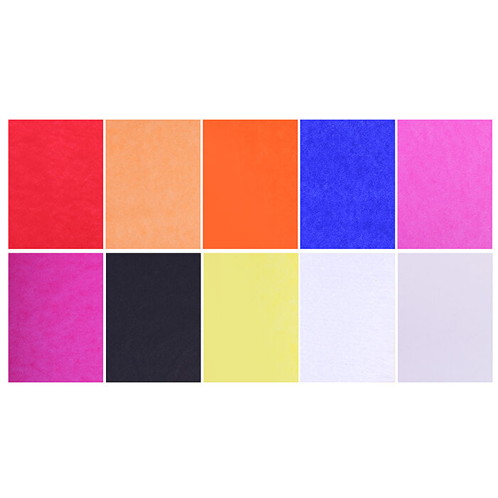 Цветная бумага тишью, 10 листов, 10 цветов, формат А4, плотность 25 гр/м2. Внутренний блок - тонкая цветная полупрозрачная бумага. В наборе цвета: красный, синий, зеленый, желтый, голубой, белый, серебряный, розовый, кремовый, лимонный. Упаковка - папка из мелованного картона с тремя клапанами. Рекомендуется детям от 3 лет.