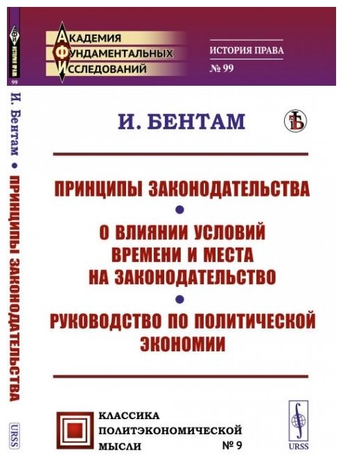 Предлагаемая читателю книга включает в себя работы выдающегося английского философа, экономиста и социолога Иеремии Бентама (1748-1832), в которых рассматриваются проблемы политической экономии и права. В работе "Принципы законодательства" исследуются такие вопросы, как действие в области законодательства принципов пользы, аскетизма, симпатии и антипатии; различные виды удовольствий и страданий и их использование в качестве санкций; границы, отделяющие мораль от законодательства; примеры ложных приемов рассуждения в области законодательства. В работе "О влиянии условий времени и места на законодательство" поднимаются проблемы необходимости осмотрительного отношения к существующим учреждениям, излагаются правила изменения и перенесения законов, рассматривается влияние времени на пользу законов. Третья работа представляет собой краткое руководство по политической экономии и посвящена исследованию вопросов о капиталах и их употреблении, о денежных ссудах, различных премиях, о конкуренции и прибыли в производстве.