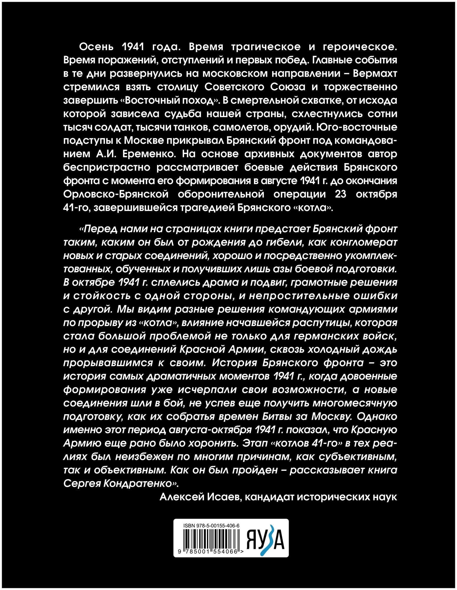 Осень 1941 года. Время трагическое и героическое. Время поражений, отступлений и первых побед. Главные события в те дни развернулись на московском направлении – Вермахт стремился взять столицу Советского Союза и торжественно завершить «Восточный поход». В смертельной схватке, от исхода которой зависела судьба нашей страны, схлестнулись сотни тысяч солдат, тысячи танков, самолетов, орудий. Юго-восточные подступы к Москве прикрывал Брянский фронт под командованием А.И. Еременко. На основе архивных документов военный историк Сергей Кондратенко беспристрастно рассматривает боевые действия Брянского фронта с момента его формирования в августе 1941 г. до окончания Орловско-Брянской оборонительной операции 23 октября 41-го, завершившейся трагедией Брянского «котла».