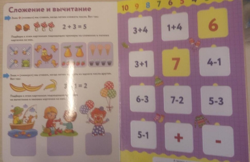 В этой книге можно получить первую информацию о цифрах, с карточками оно как-то удобнее. Есть и просто цифры, есть и точки, а также состав числа и простые примеры. Под ними – идентичные по количеству бабочки или улитки. Доставать удобно, тк есть выемка для пальчика. На левой странице задания на счёт, довольно простые. Иллюстрации малышовые.