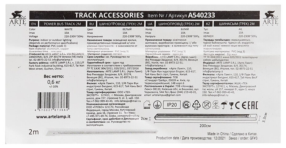 Шинопроводы Arte Lamp A540233 серии TRACK ACCESSORIES. Подчеркнет стиль помещения. Длина 2 m. Параметры пылевлагозащиты IP — 20. Материал/цвет арматуры алюминий/белый. Страна происхождения бренда — ИТАЛИЯ.